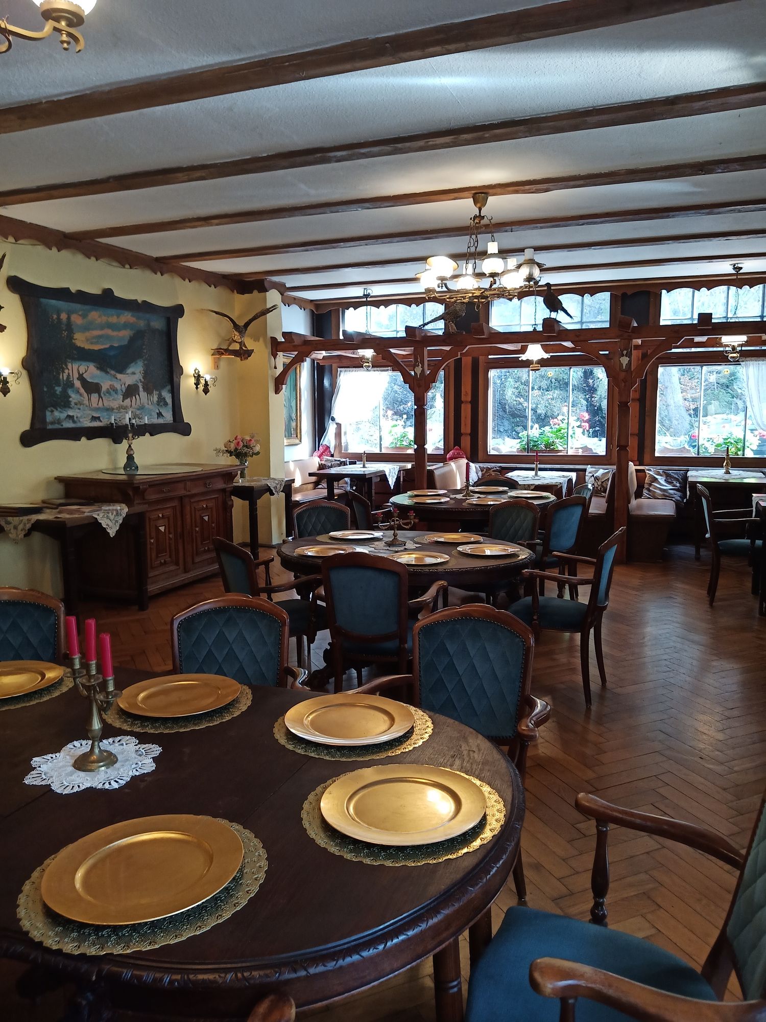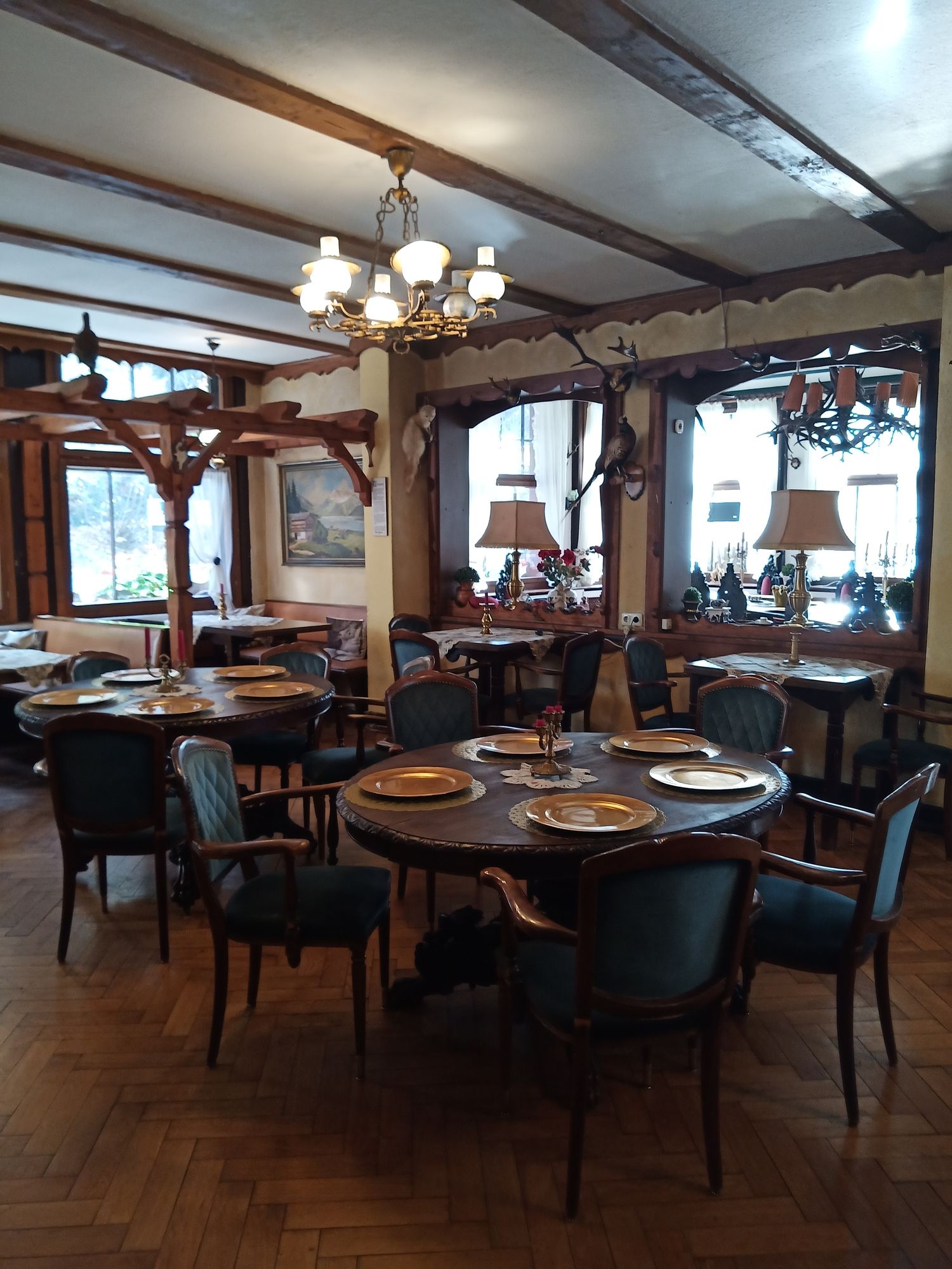 Eine abwechslungsreiche Speisekarte bietet Gaumenfreunden von der Currywurst bis zur Schweinshaxe. Als ehemaliges Jagdschlösschen werden natürlich auch Wildspezialitäten angeboten.