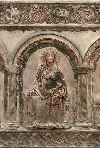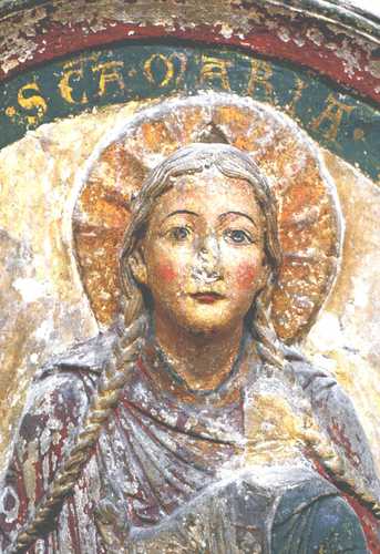 Nordseite - Christus und sechs Apostel; Südseite - Maria und sechs Apostel. Die Figuren wurden um 1200 aus "Stuck" geschaffen und zeigen Farbreste aus sehr früher Zeit. Aus jener Zeit sind "Erhaltensein" und "lebendige Darstellung" einzigartig im europäischen Raum.