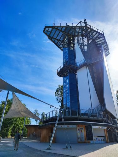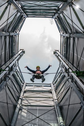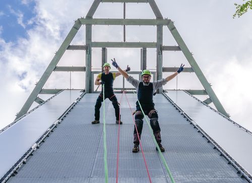WALLRUNNING: Sie schauen vom Aussichtsturm in 39 Metern Höhe nicht nur in die Ferne, sondern laufen (an Seilen gesichert) auch noch an ihm herunter. Hört sich angstfreier an, als es ist...