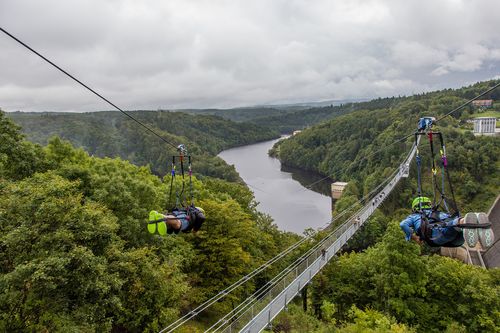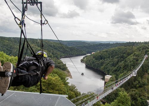 MEGAZIPLINE: Europas einzigrtige Doppelseilrutsche über das Rappbodetal. Sie fliegen an Seilen befestigt ca. 1 Kilometer in der Waagerechten über die Rappbode und haben 120 Meter Abgrund unter sich. Sie können uns glauben - bei 85 km/h - ein unbeschreibliches Gefühl!