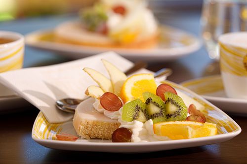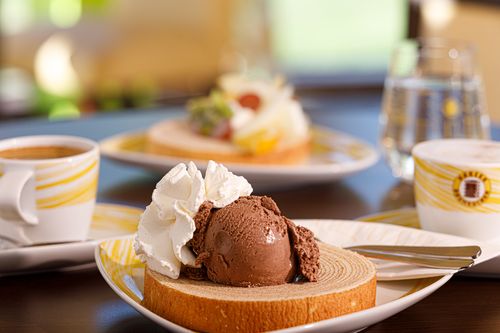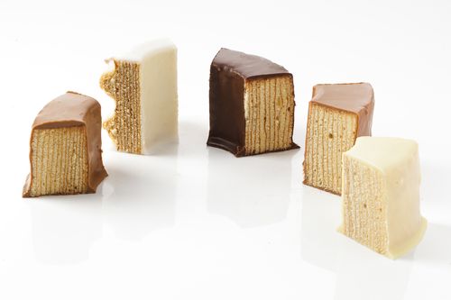 Einen eigens kreierten Baumkuchenziegel (ähnlich einer Sahnetorte) gibt es mit Saisonal unterschiedlichen Sahnefüllungen.