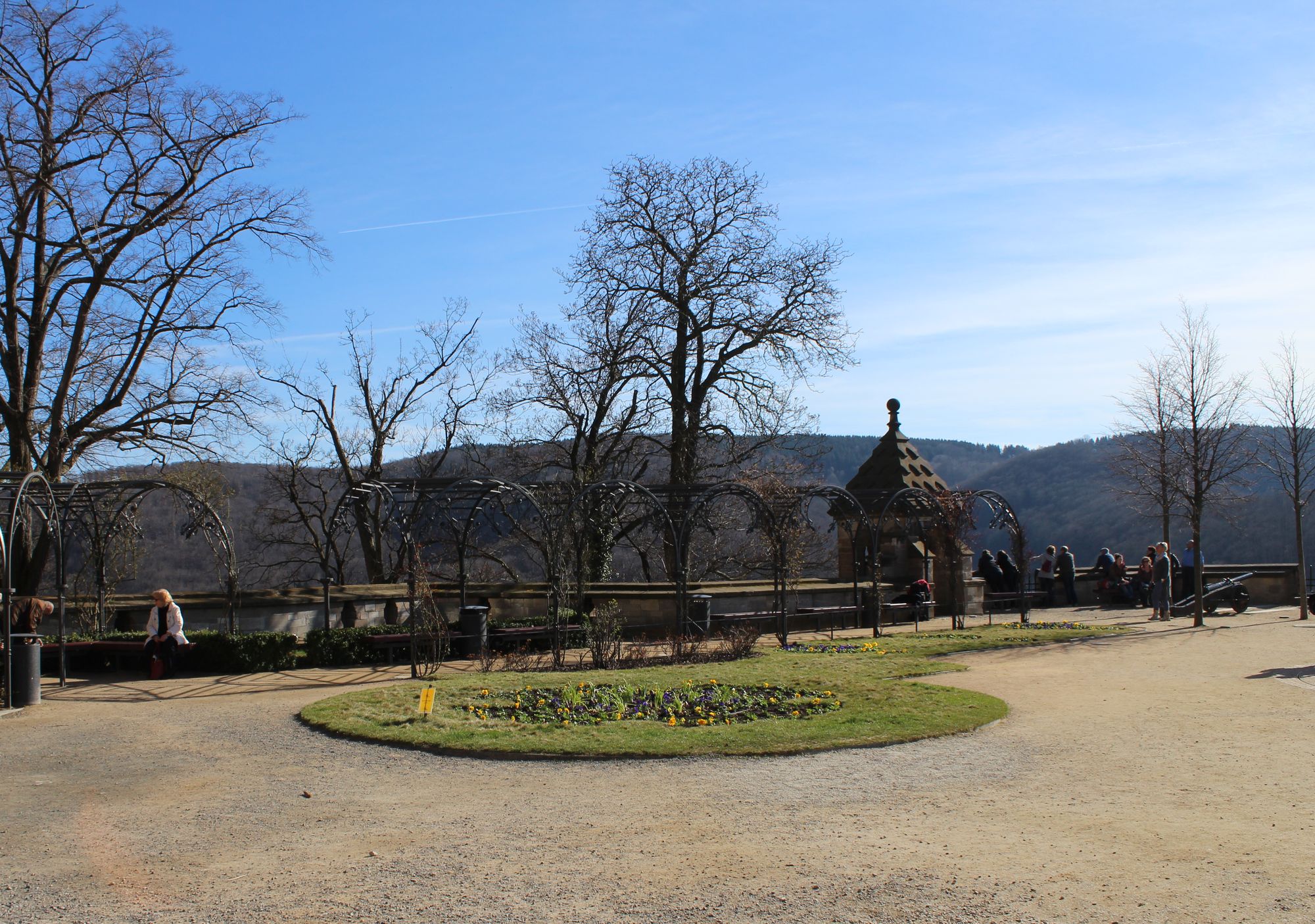 Großzügige Terrasse mit kleinem Gartenteil und Schlossblick und natürlich kostenfreies WLAN.