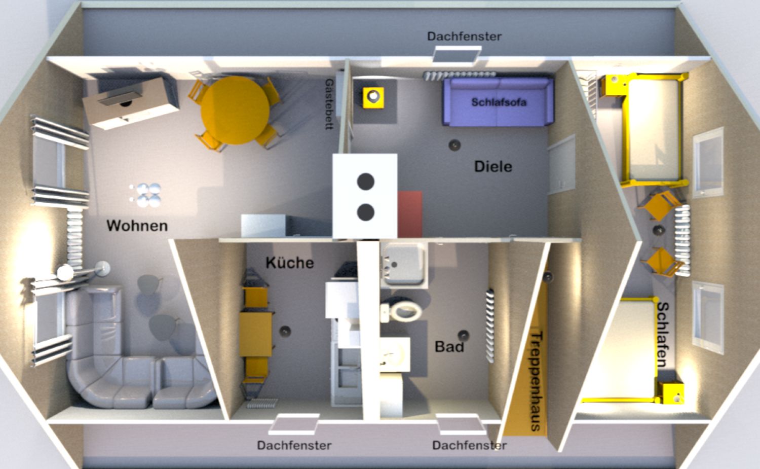 Die Einrichtung des Ferienhausese ist ein Mix aus modernem Mobiliar, mit individuell selbst gestalteten Einrichtungselementen - wohnlich und praktisch für Familien, aber auch für befreundete Paare oder Gruppen.
