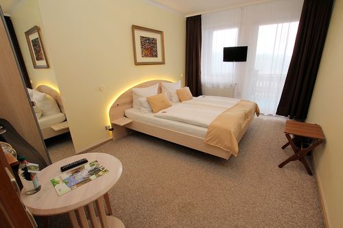 Zimmer sind mit Doppelbett, Sitzecke, TV und Bad mit DU/WC/Föhn ausgestattet (teilweise mit Balkon)