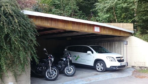 kostenfreie Parkplätze direkt an der Pension, abschließbare Garage für PKW, Motorräder und Mountainbike nach Absprache nutzbar