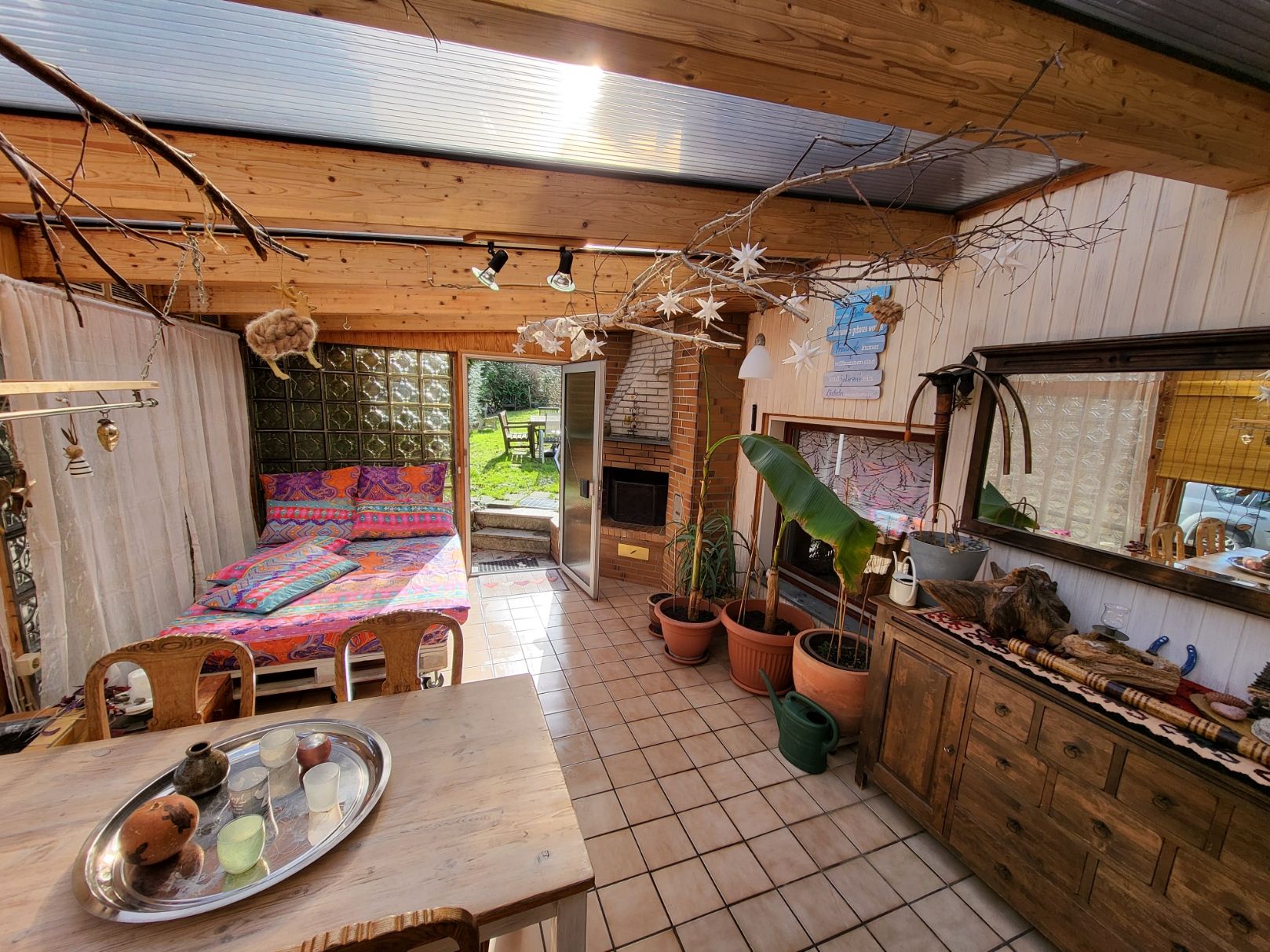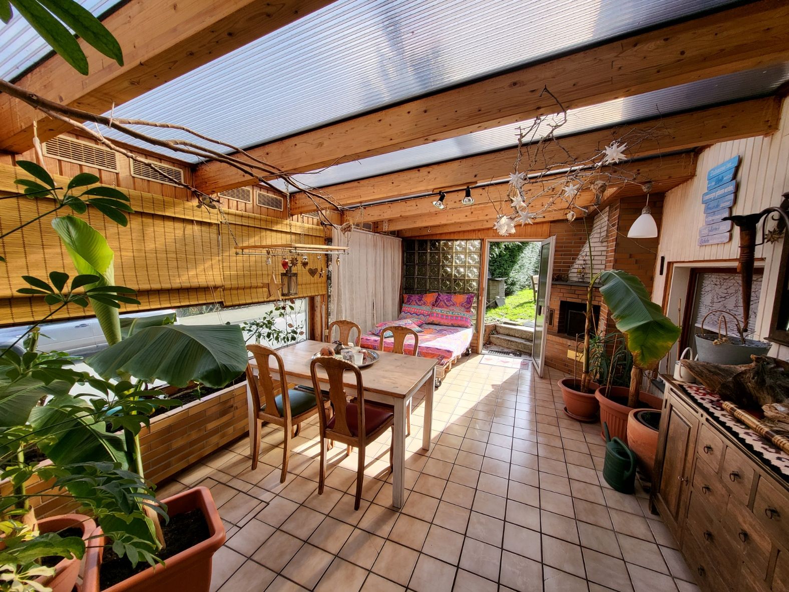 Wintergarten zum wind- und wettergeschützen Aufenthalt mit einem offenen Kamin