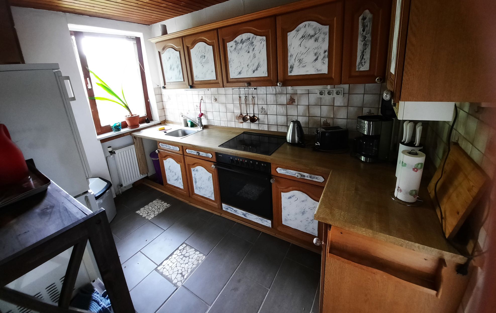 Küche mit 4-Platten-Elektroherd mit Backofen, Kühlschrank, Gefrierschrank, Mikrowelle, Toaster, Wasserkocher, Kaffeemaschine sowie komplette Geschirr- und Kochausstattung für mindestens 6 Personen.