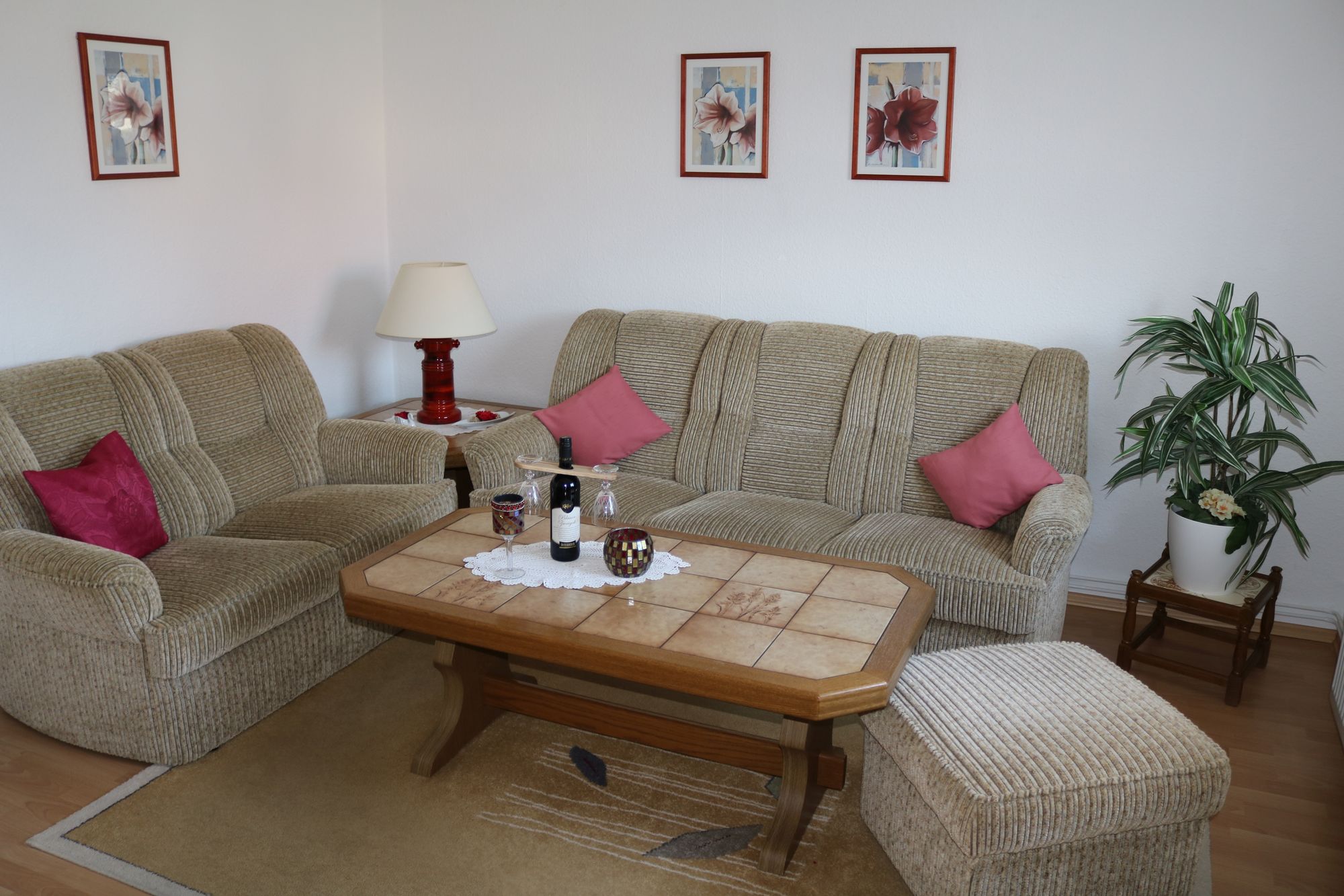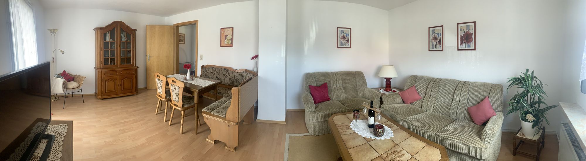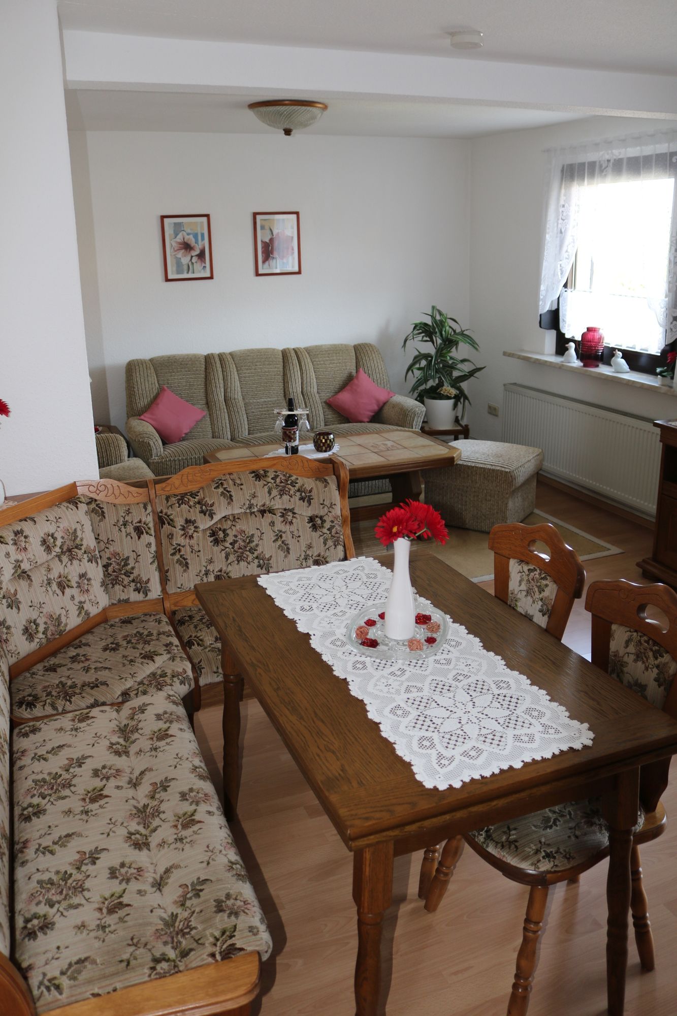 Wohnzimmer mit gemütlicher Couchecke und zusätzlicher Essecke, SAT-TV, Hifi-Anlage, CD-PLayer und Zugang zum Balkon