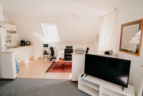 Küche mit Ceran-Kochfeld (2-Felder), Gefrierfach, Geschirrspüler, Mikrowelle, Kaffeemaschine, Wasserkocher, Eierkocher, Toaster und Esstisch