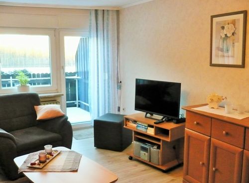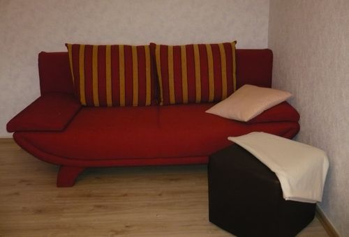 Es erwartet Sie ein Wohnbereich (Laminatfußboden) mit gemütlicher Sitzecke und einer bequemen, separat stehenden Schlafcouch für 2 Personen mit einem Ausgang zum Balkon. Flachbild-Fernseher und CD-Player.