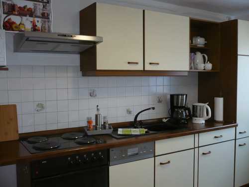 Das Schlafzimmer (Laminatfußboden) verfügt über ein Doppel- und ein Einzelbett (komfortable Matratzen) Die separate Küche mit einem Essplatz ist sehr gut ausgestattet - mit E-Herd und Backofen, Mikrowelle, Kühlschrank mit Gefrierfach, Geschirrspüler, Wasserkocher, Toaster, Eierkocher und Kaffeemaschine. Ein kleines Sortiment an Tee und Gewürzen sowie Spülmittel und Tücher sind vorhanden.