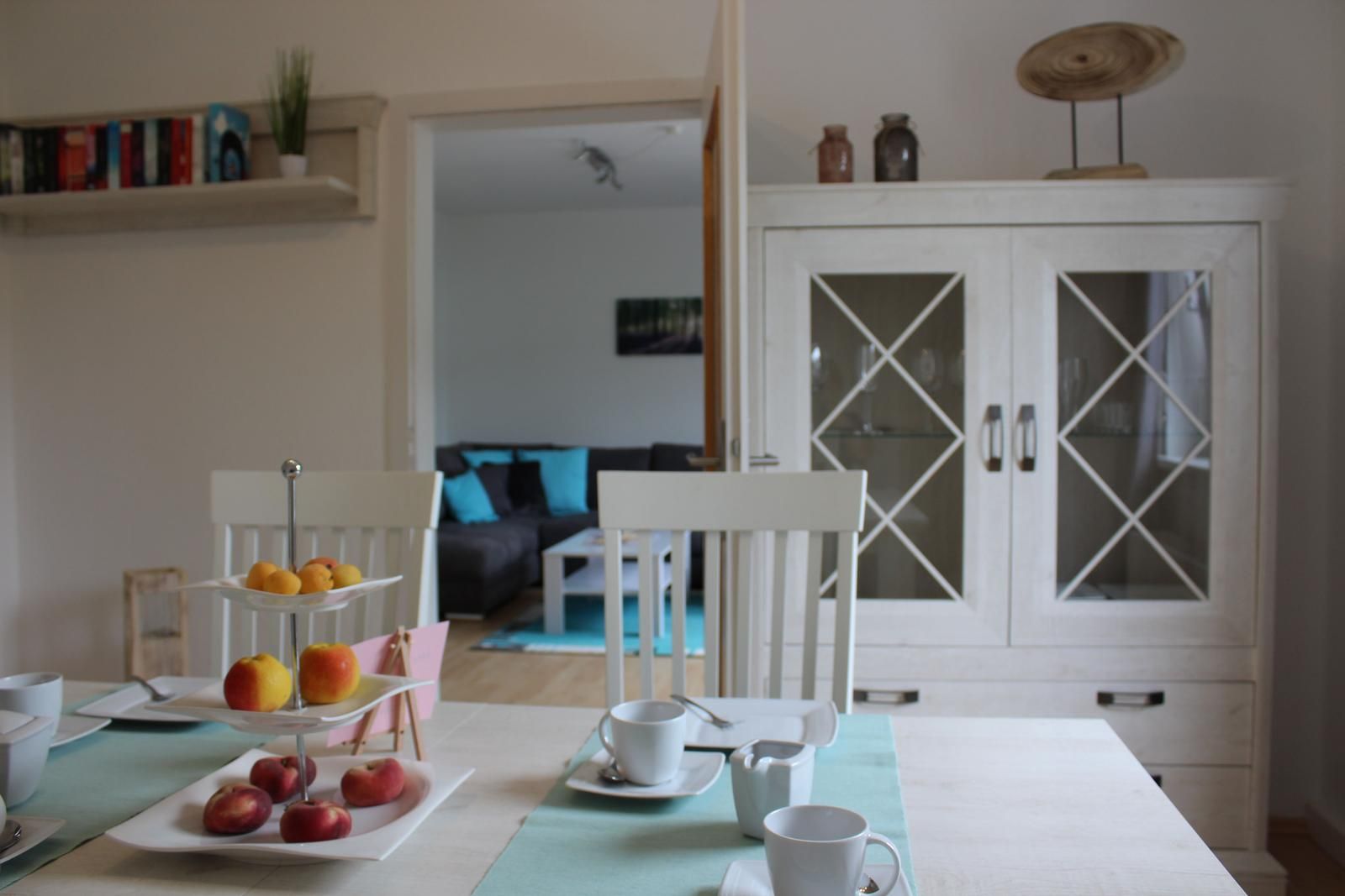 Die Einrichtung der Ferienwohnung ist in hellem Weiß und weiteren frischen Farbtönen gehalten, um Lebensfreude zu vermitteln und Ihnen so einen guten Start in den Tag zu ermöglichen. Die Ferienwohnung befindet sich in der 1. Etage in einer ruhigen Stadtrandlage.