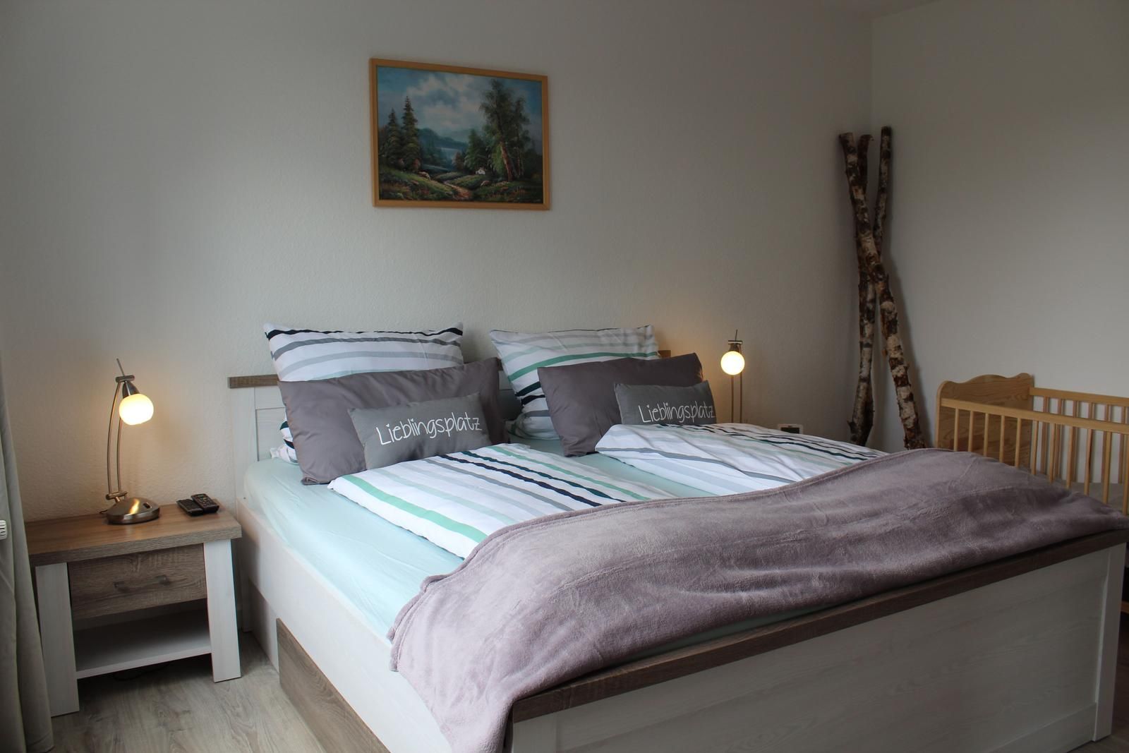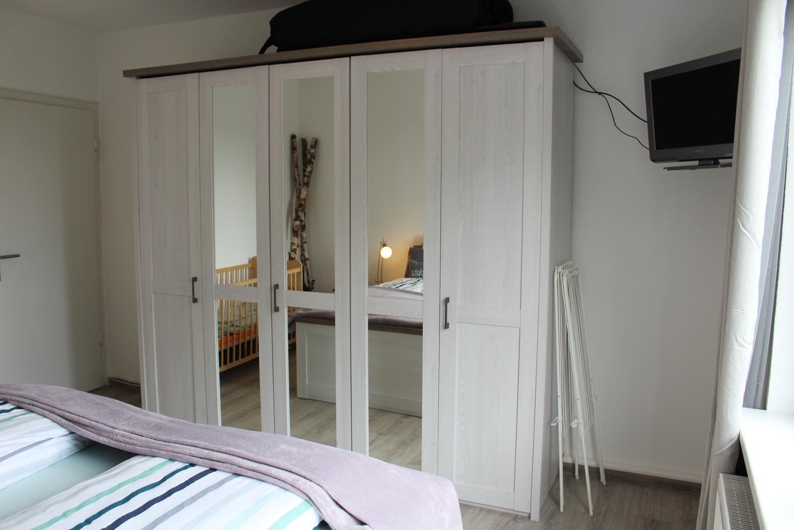 Schlafzimmer mit Doppelbett, großem Kleiderschrank, Babybett und Fernseher