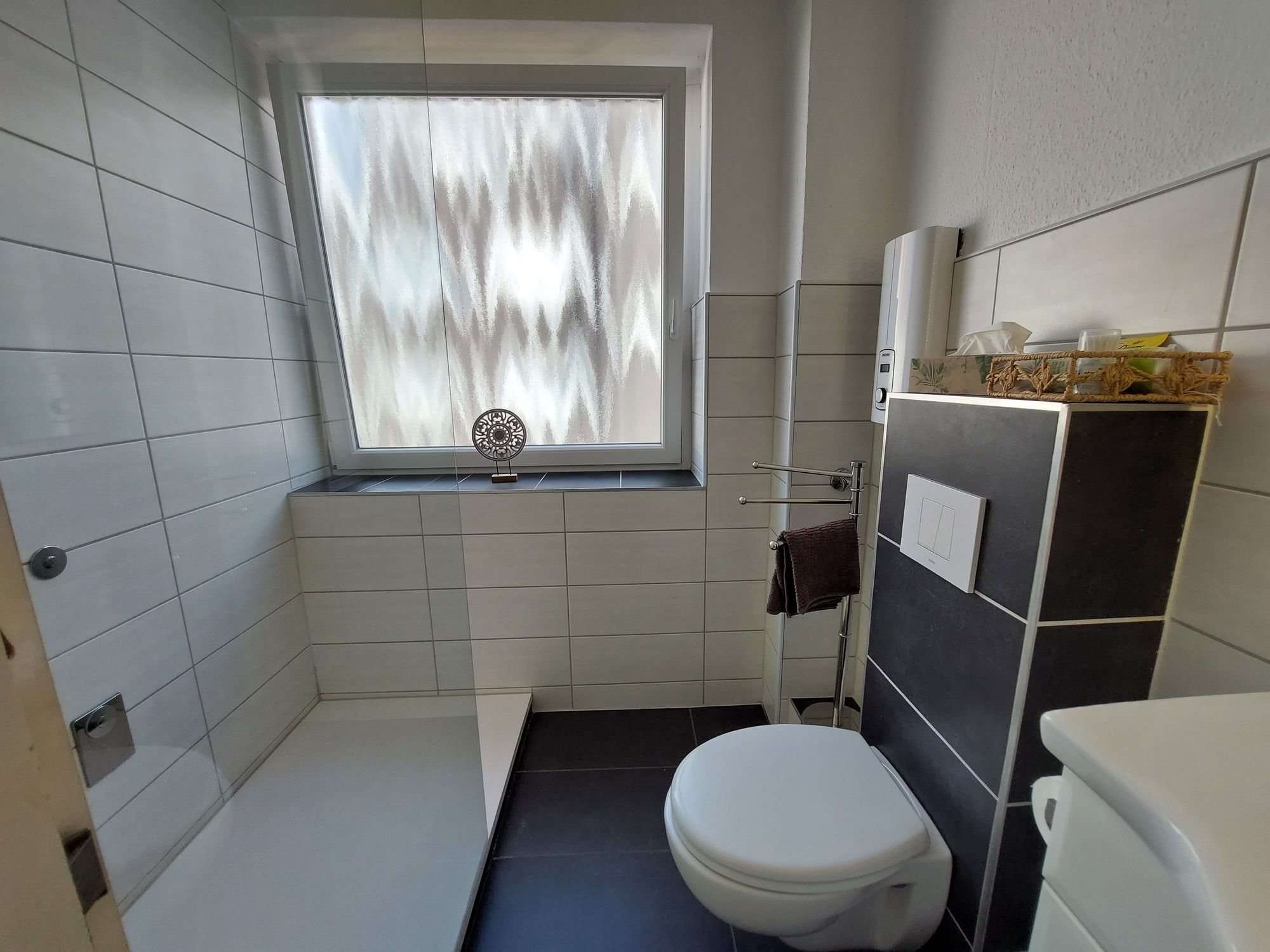 1 Bad mit ebenerdiger großer Regen-Dusche und WC (ausgestattet mit Fön)