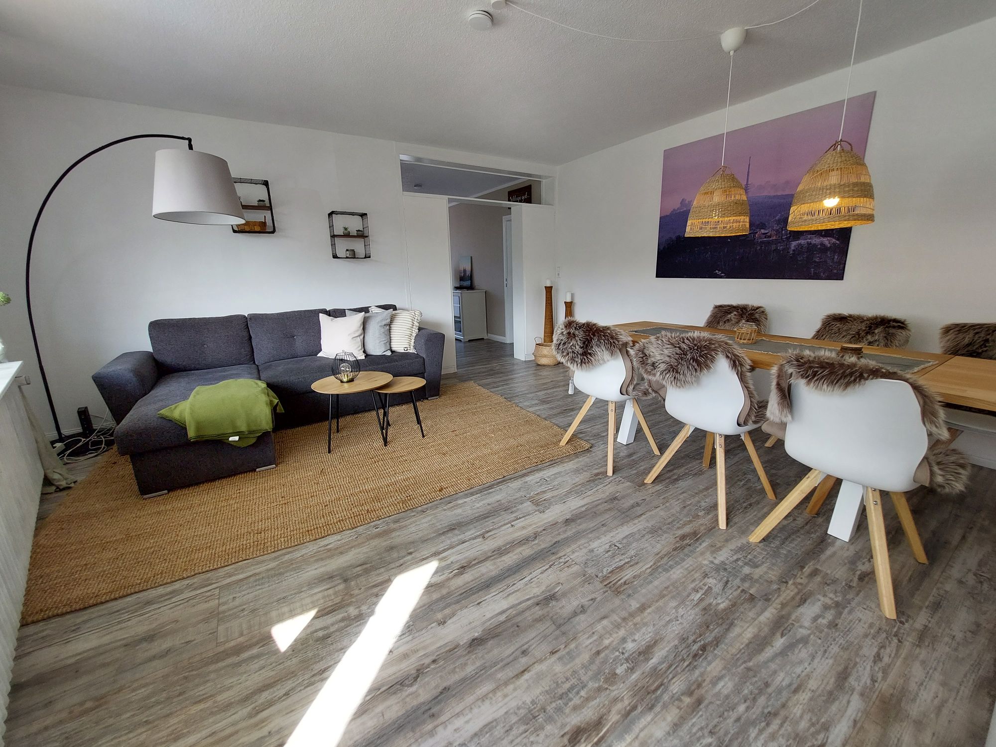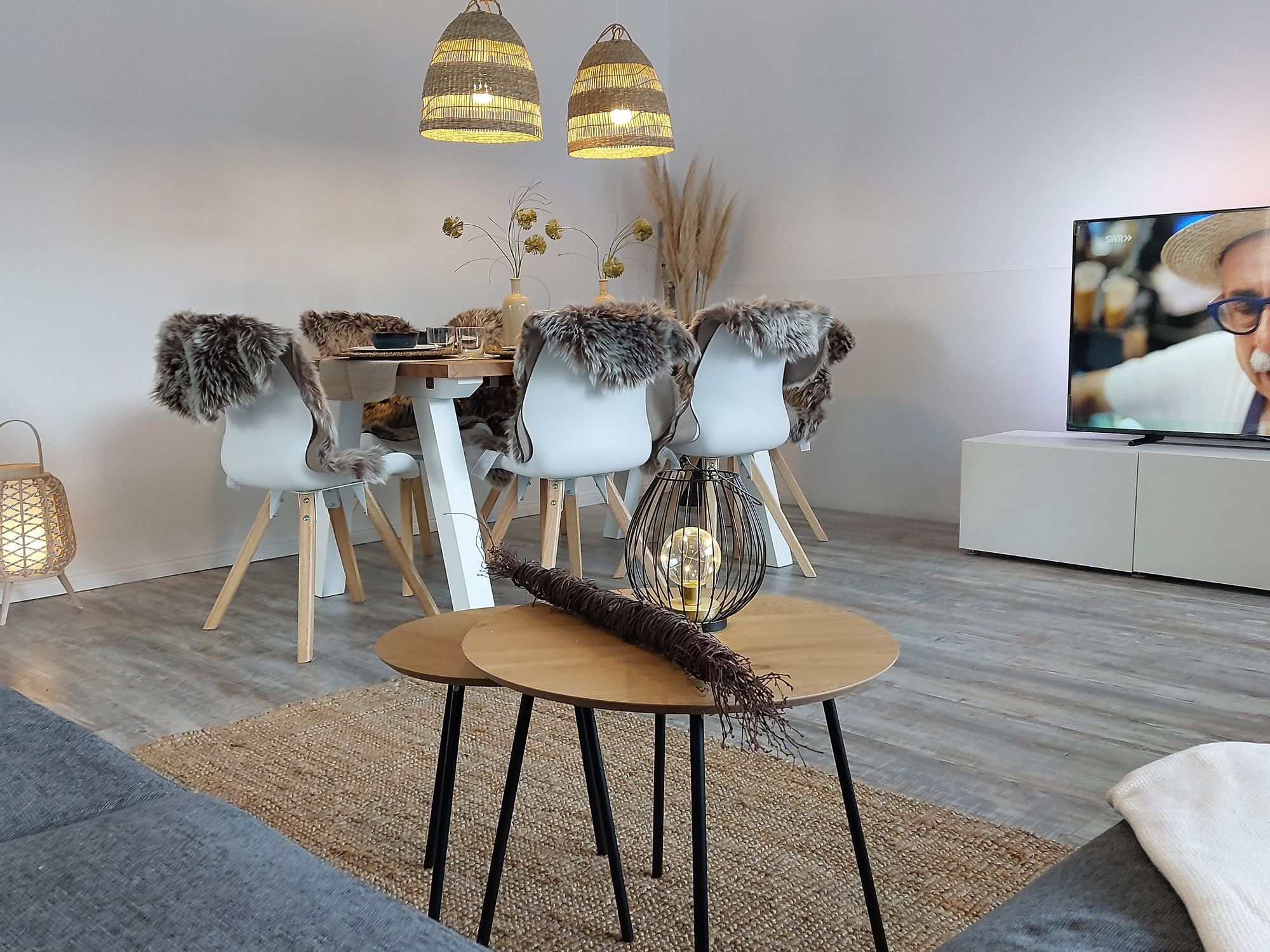 Großzügig geschnittenes Wohnzimmer mit Ecksofa mit Schlaffunktion (1 Aufbettung möglich), Esstisch für 6 Personen, 55 Zoll Smart-TV mit Netflix, ambilight
