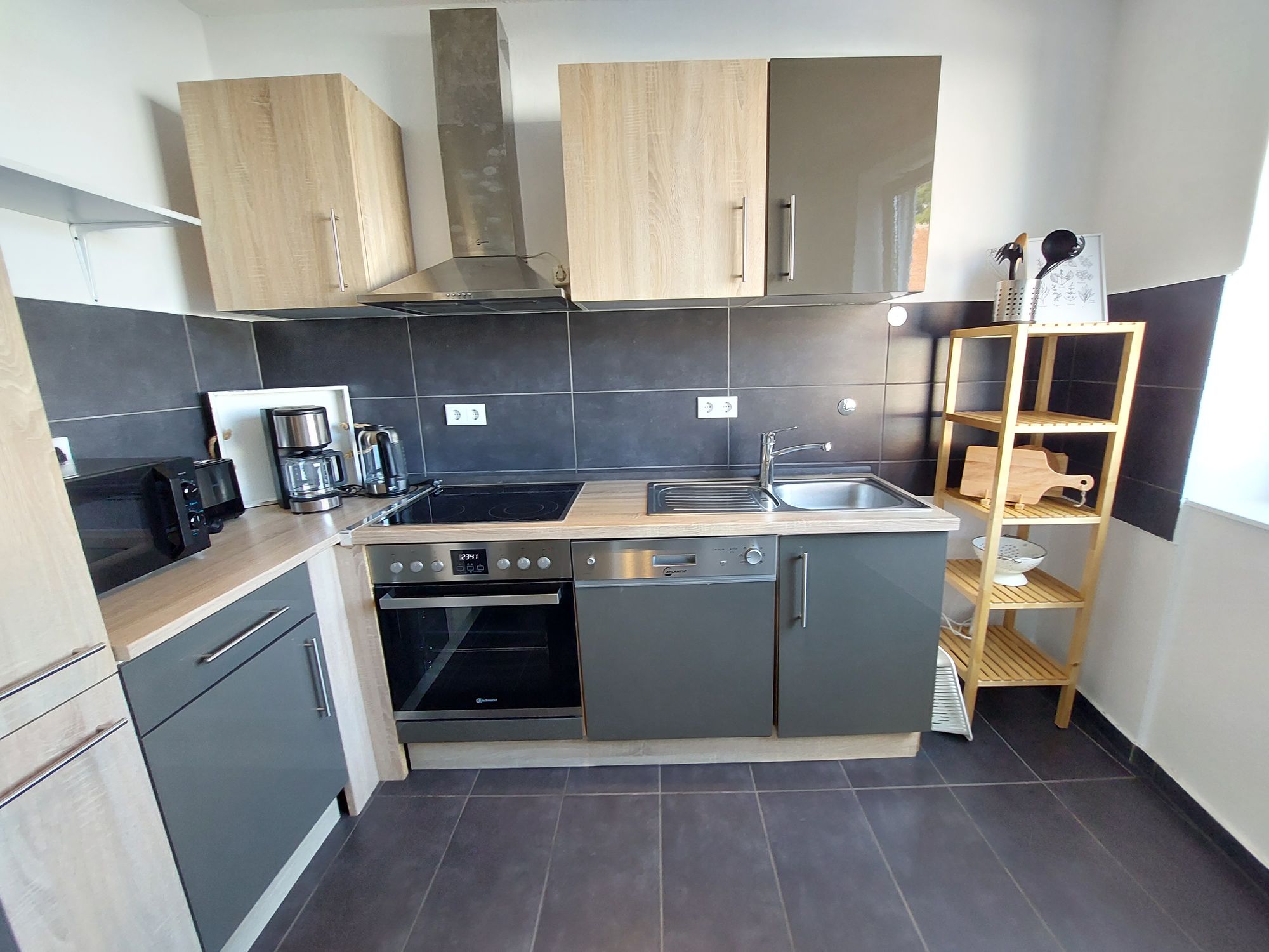 Separate und voll ausgestattete Küche mit Elektroherd mit Backofen, Kühlschrank, Gefriermöglichkeit, Toaster, Geschirrspüler, Kaffee- und Nespresso-Maschine, Wasserkocher
