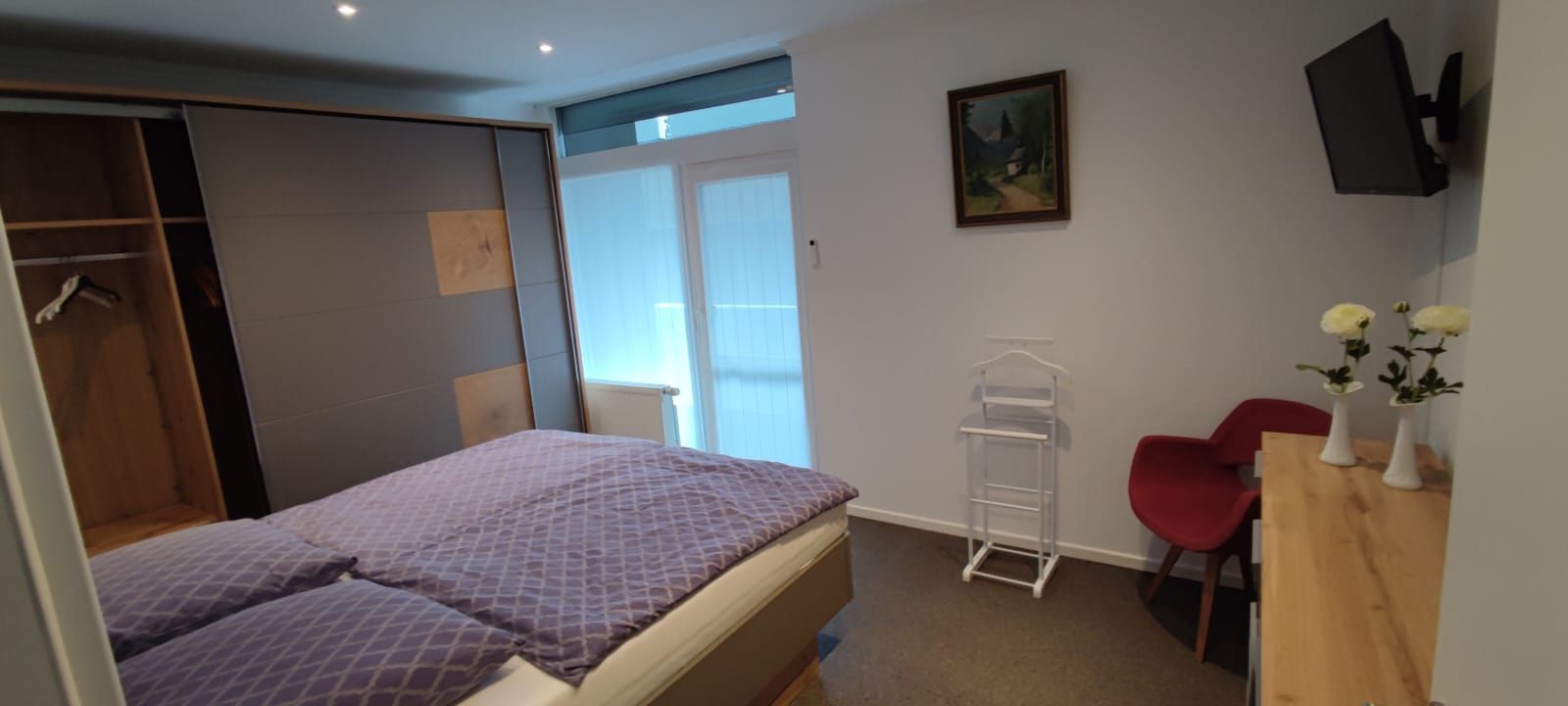 Schlafzimmer mit Doppelbett, Fernseher und großem Schrank