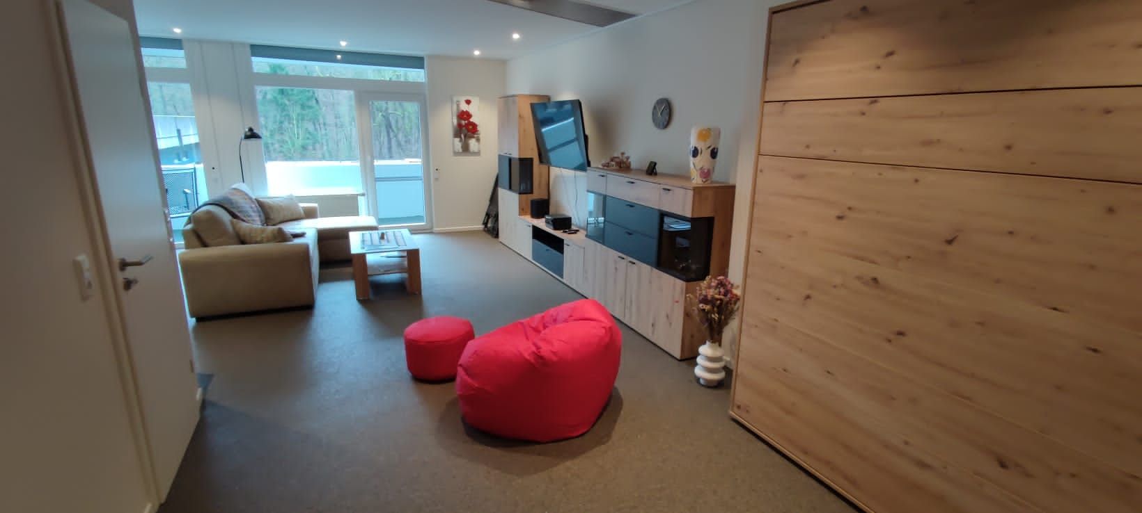 (gemütliche Sitzecke bzw. Schlafcouch, ein Bettenschrank mit herunterklappbarem Doppelbett, Fernseher)