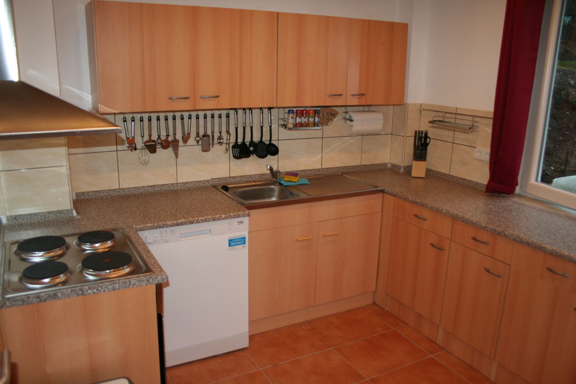 Voll ausgestattete Küche mit 4-Platten-Herd, Kühlschrank, Gefrierschrank, Backofen, Kaffeemaschine, Wasserkocher, Toaster