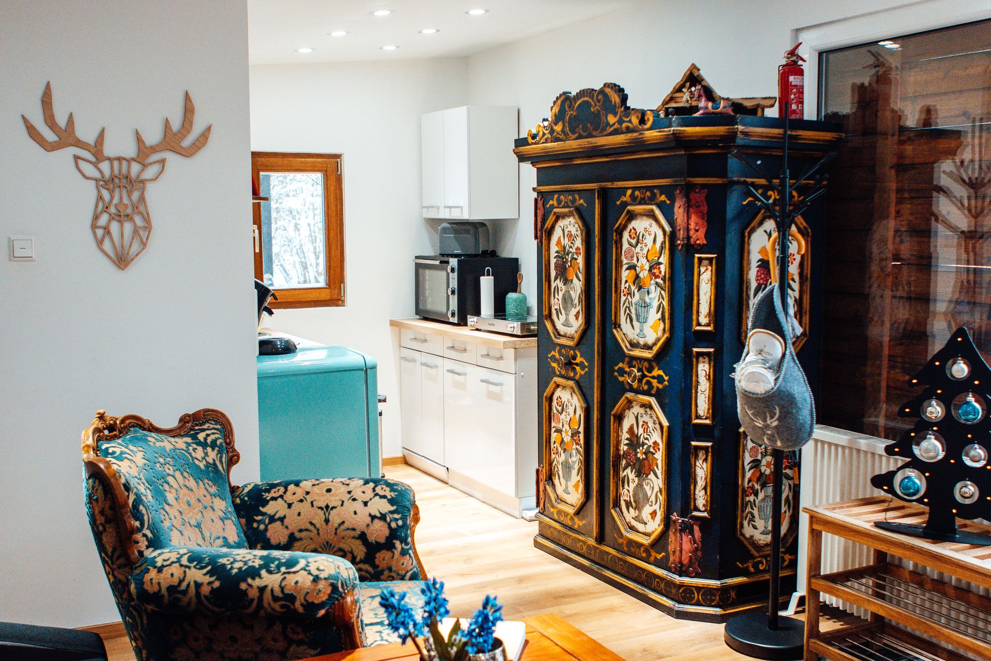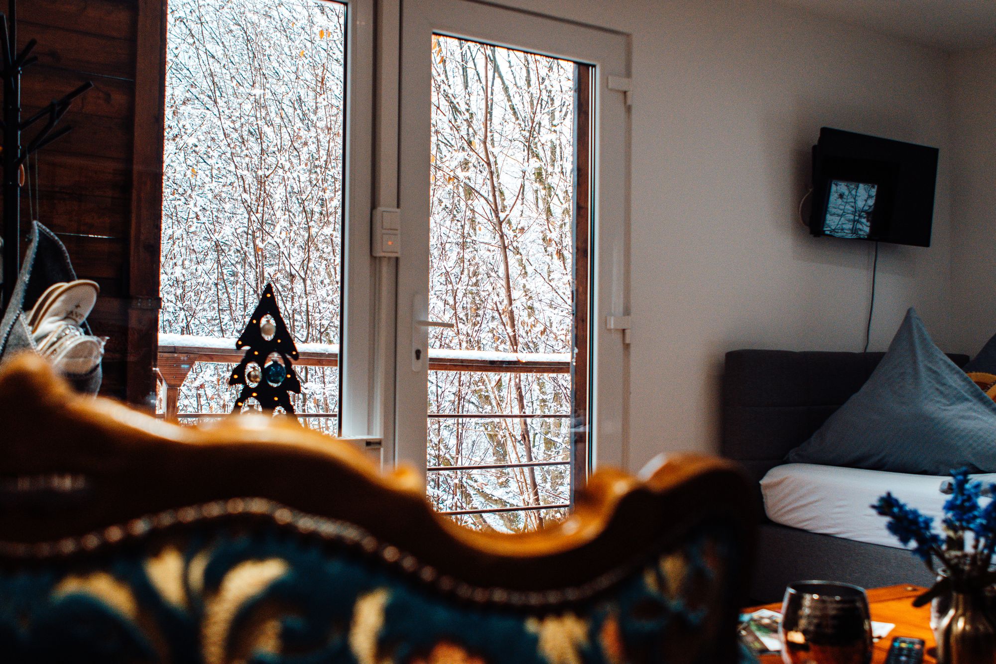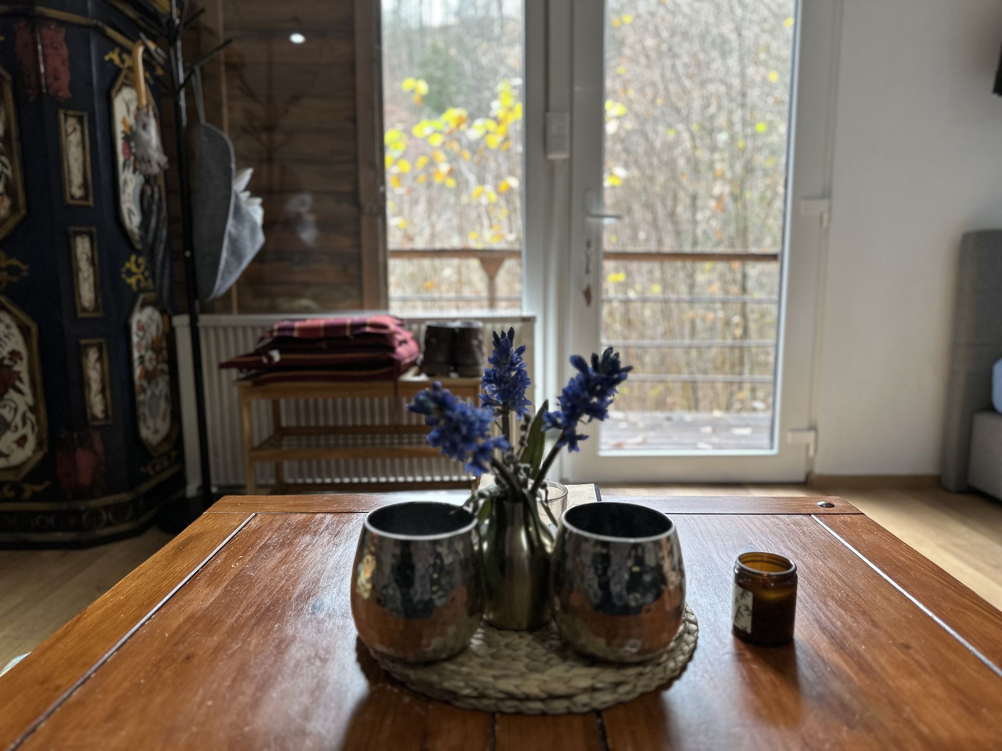 Die Einrichtung ist sehr individuell in warmen Farbtönen gehalten, der Kaminofen verbreitet nicht nur an kalten Wintertagen eine wohlige Atmosphäre. Dann noch ein verträumter Blick aus den großen Fenstern in den Wald - das ist Erholung...