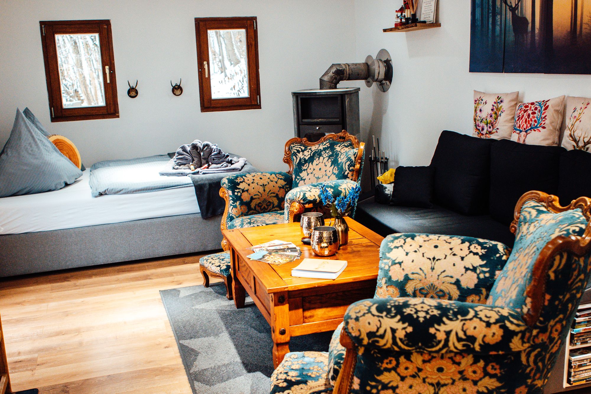 Wohnbereich mit gemütlicher Schlafcouch, TV und Kaminofen