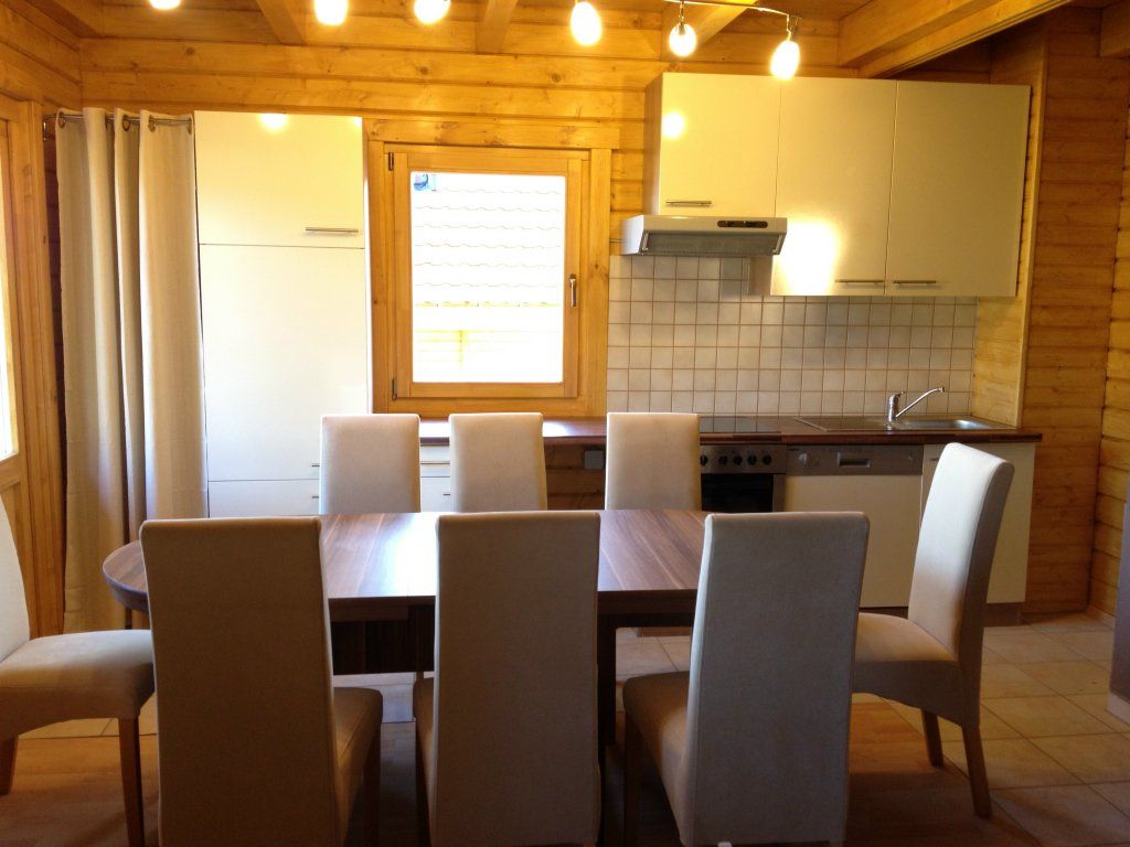 Blockhaus-Küche im Wohn- und Esszimmer mit 4-Platten-Kochfeld, Kühl- und Gefrierschrank, Mikrowelle, Backofen, Geschirrspüler