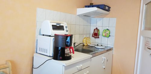 Küche mit zwei Kochplatten, Mikrowelle, Kühlschrank, Tiefkühlschrank, Kaffeemaschine, Wasserkocher