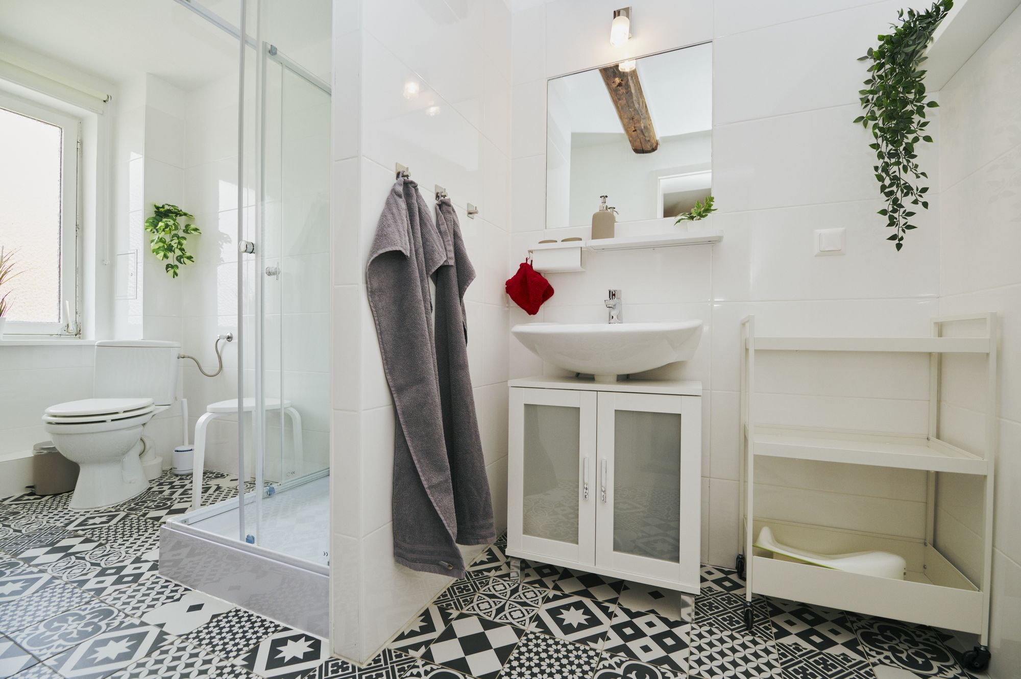 Badezimmer mit Dusche, WC und Fenster (Tageslicht), Haartrockner