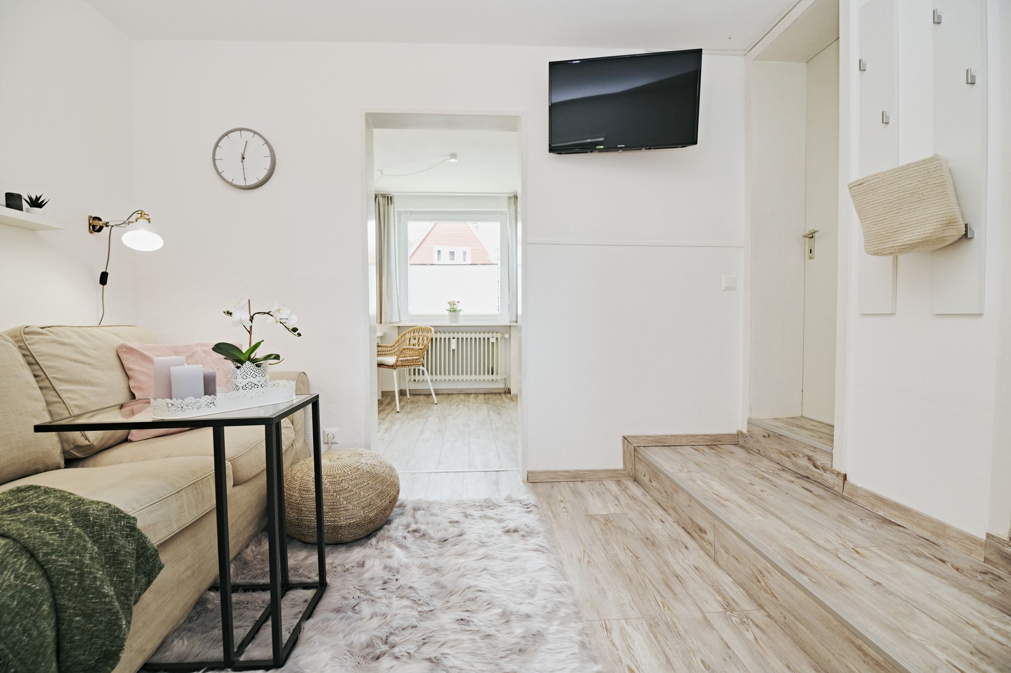 Wohnbereich mit gemütlichem Sofa (3-Sitzer), Flachbildschirm mit 32 Zoll (Smart-TV), DVD/Blue-Ray Player