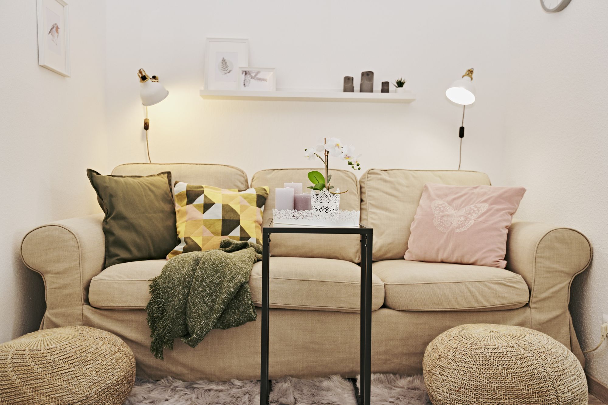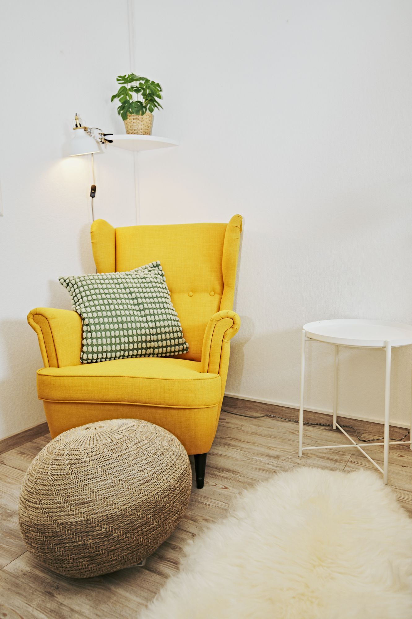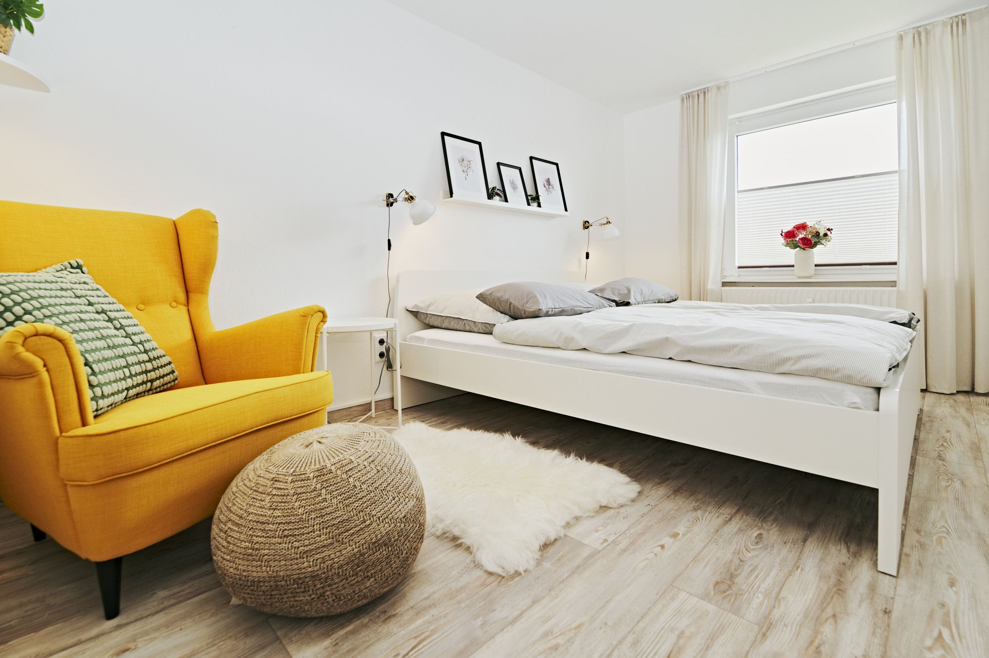 Das Sofa ist wunderbar geeignet zum Kuscheln, Fernsehen oder zum Lesen. Auch im Schlafzimmer ist der knallgelbe Sessel für ein gutes Buch eine wunderbare Rückzugsmöglichkeit. Alle Räume sind durch das einfallende Tageslicht hell und freundlich.