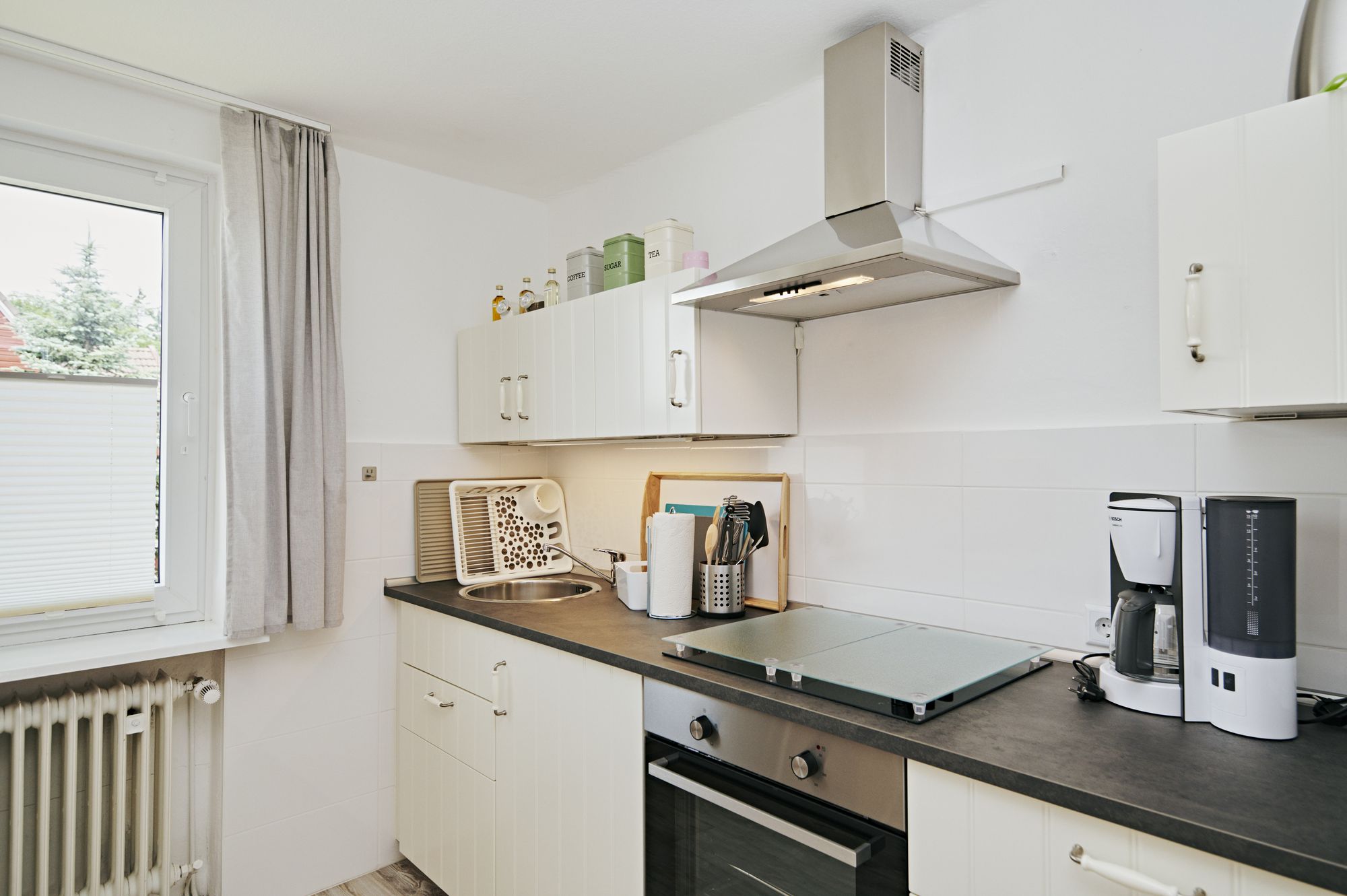 4-Felder-Elektroherd, Backofen, Mikrowelle, Kühlschrank mit Gefriereinheit, Kaffeemaschine, Wasserkocher, Toaster uvm.