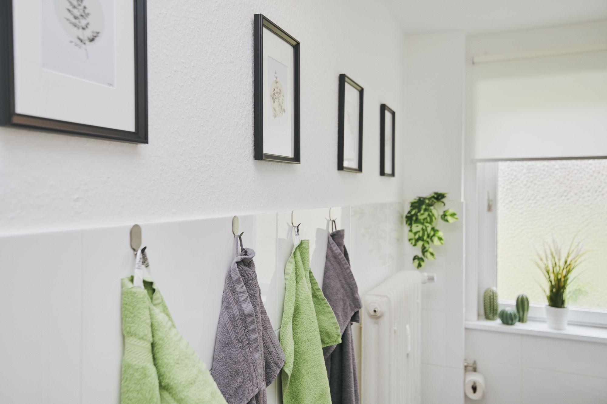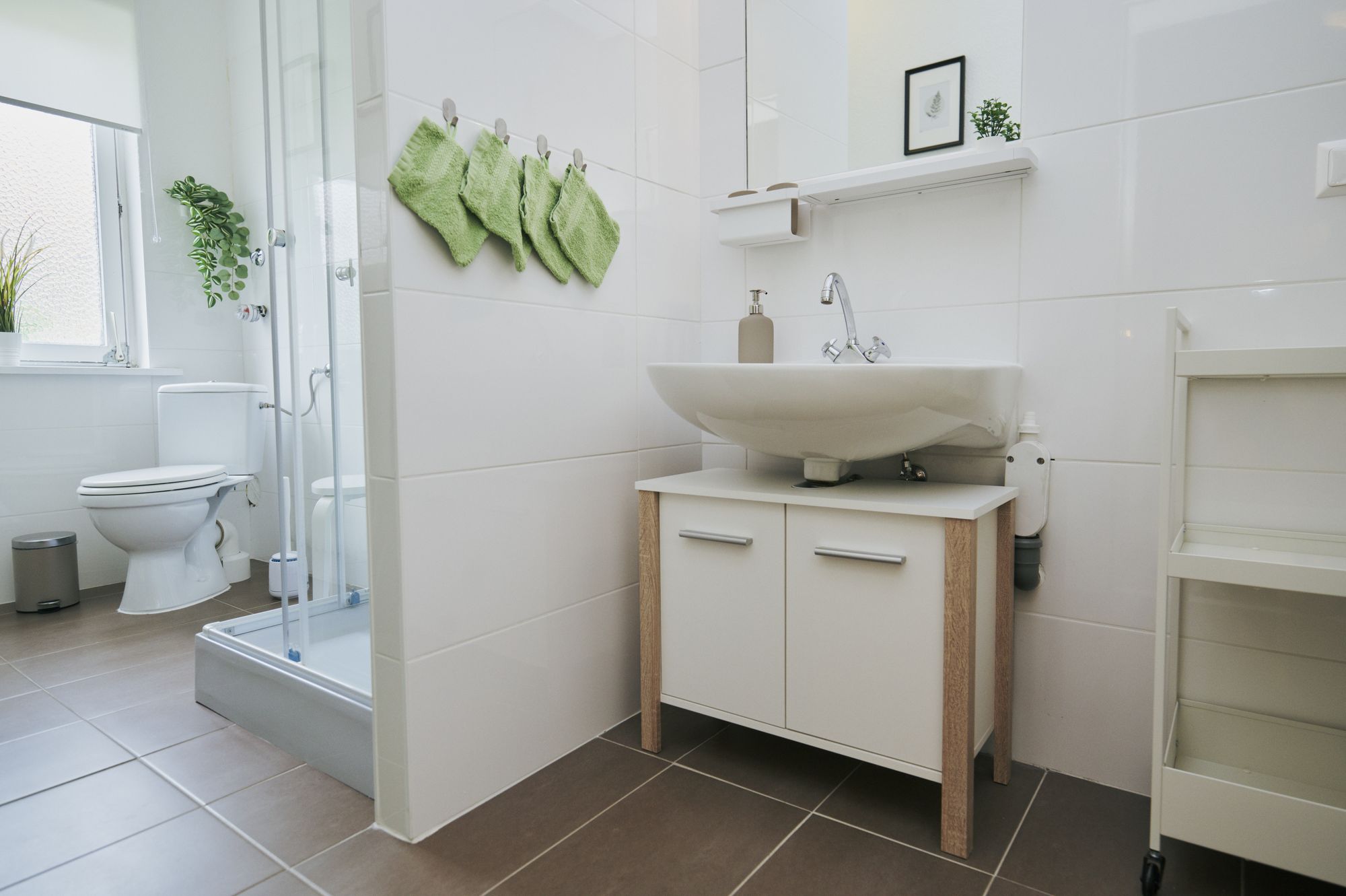 Badezimmer mit Dusche, WC und Fenster (Tageslicht), Haartrockner