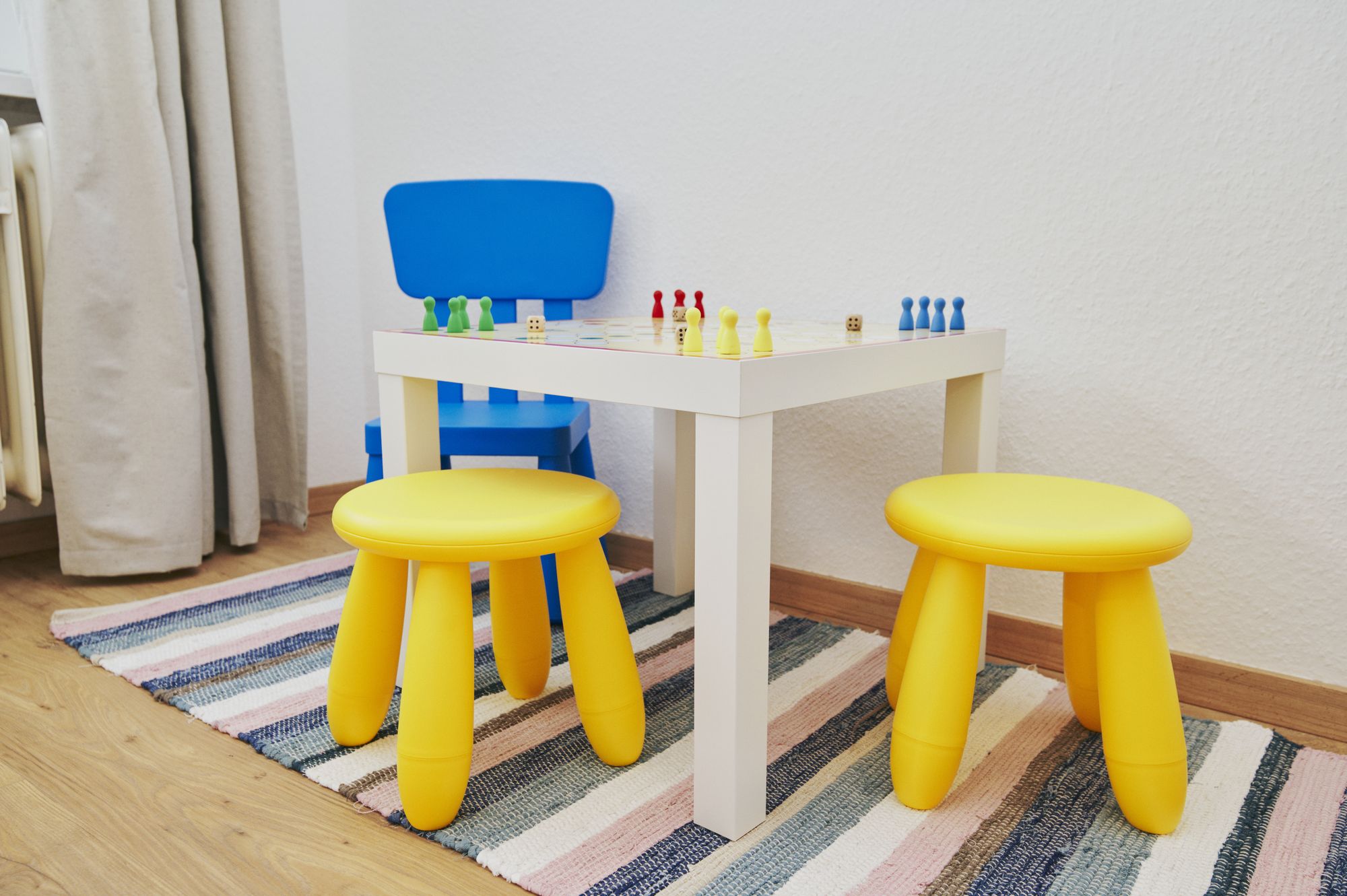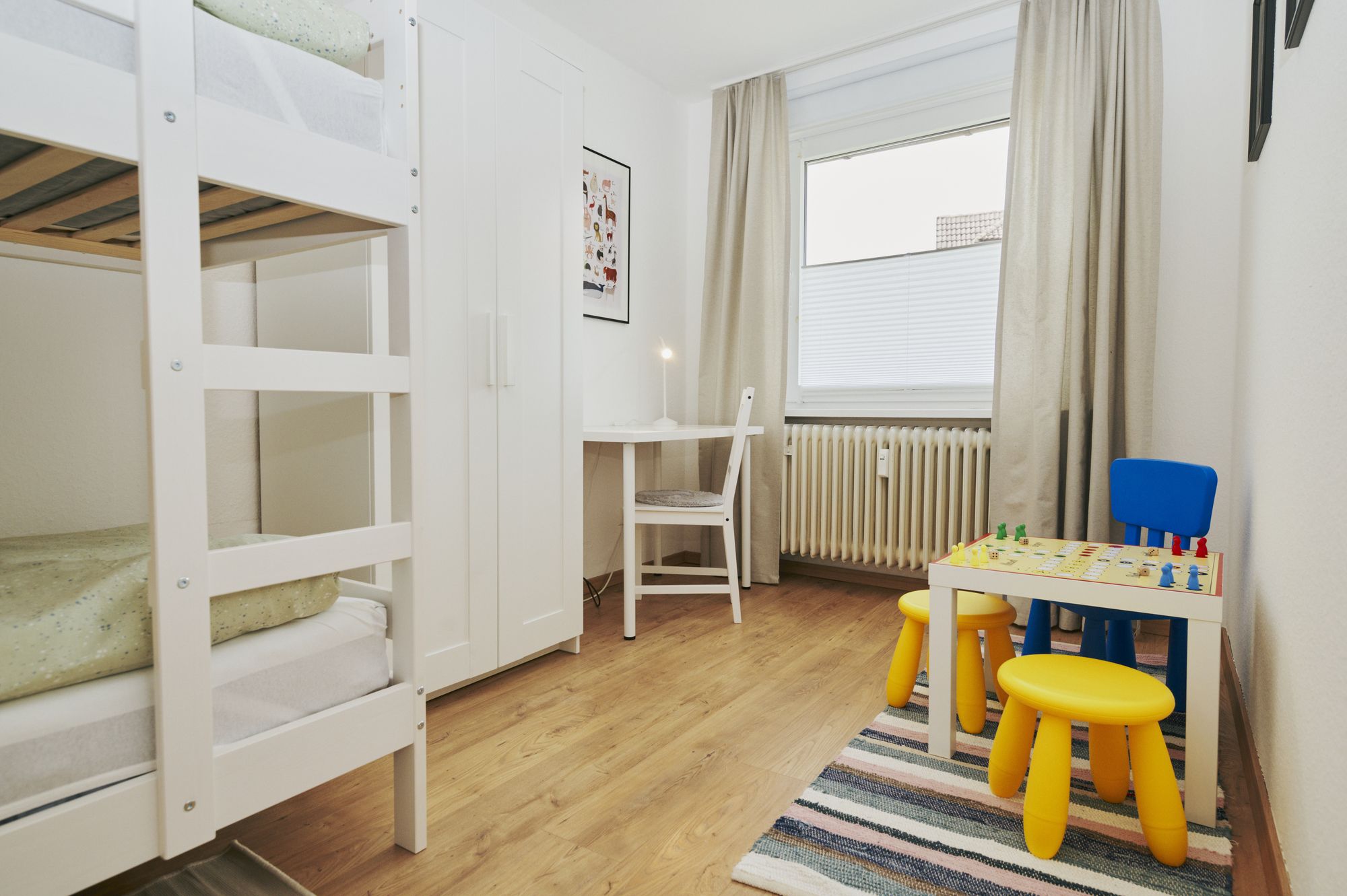 Kinderzimmer mit Doppelstockbett, Kleiderschrank, Schreib- und Basteltisch, Kinder-Sitzgruppe