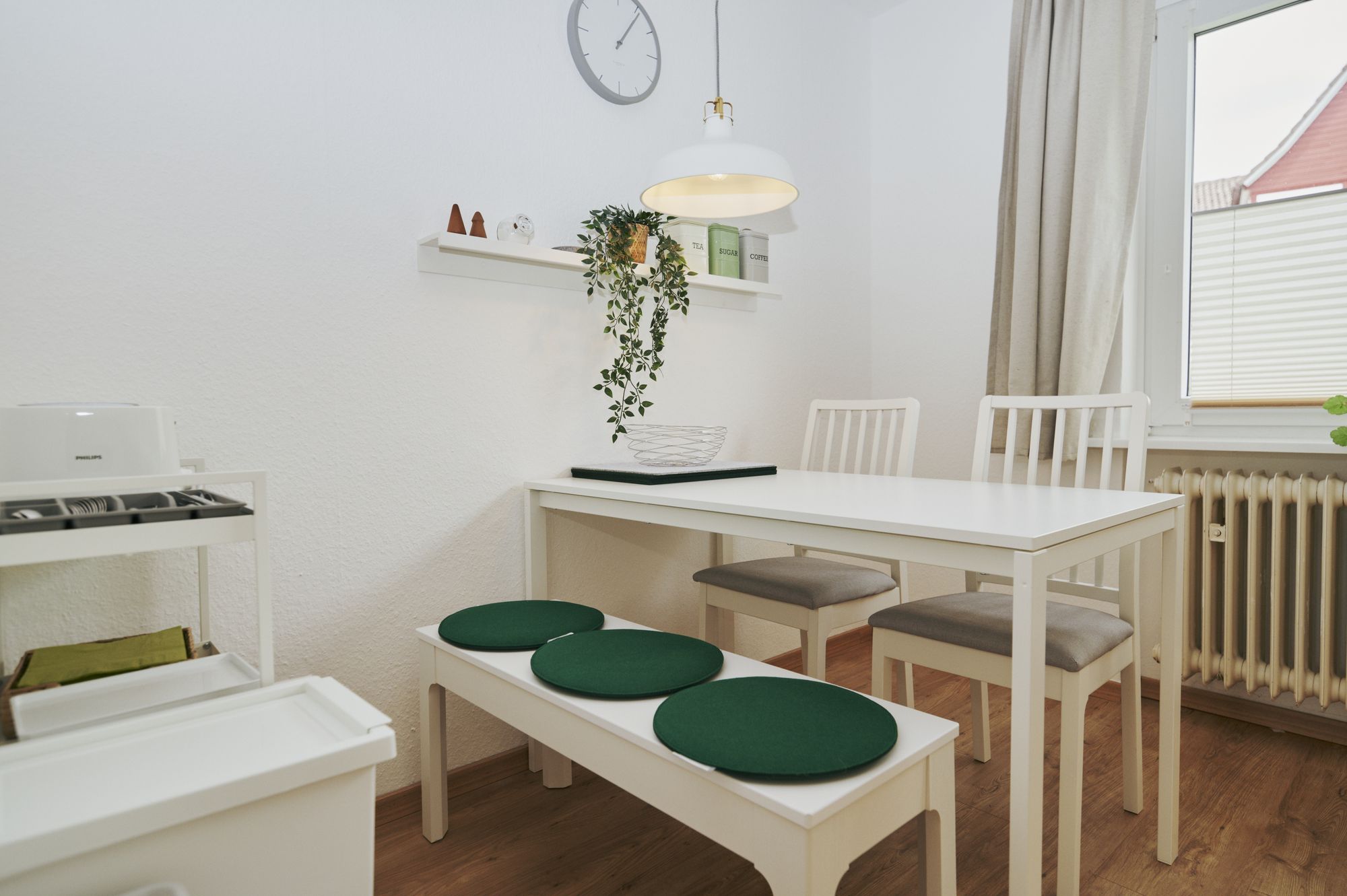 und gemütlicher Essbereich am Fenster mit 2 Stühlen und 1 Sitzbank