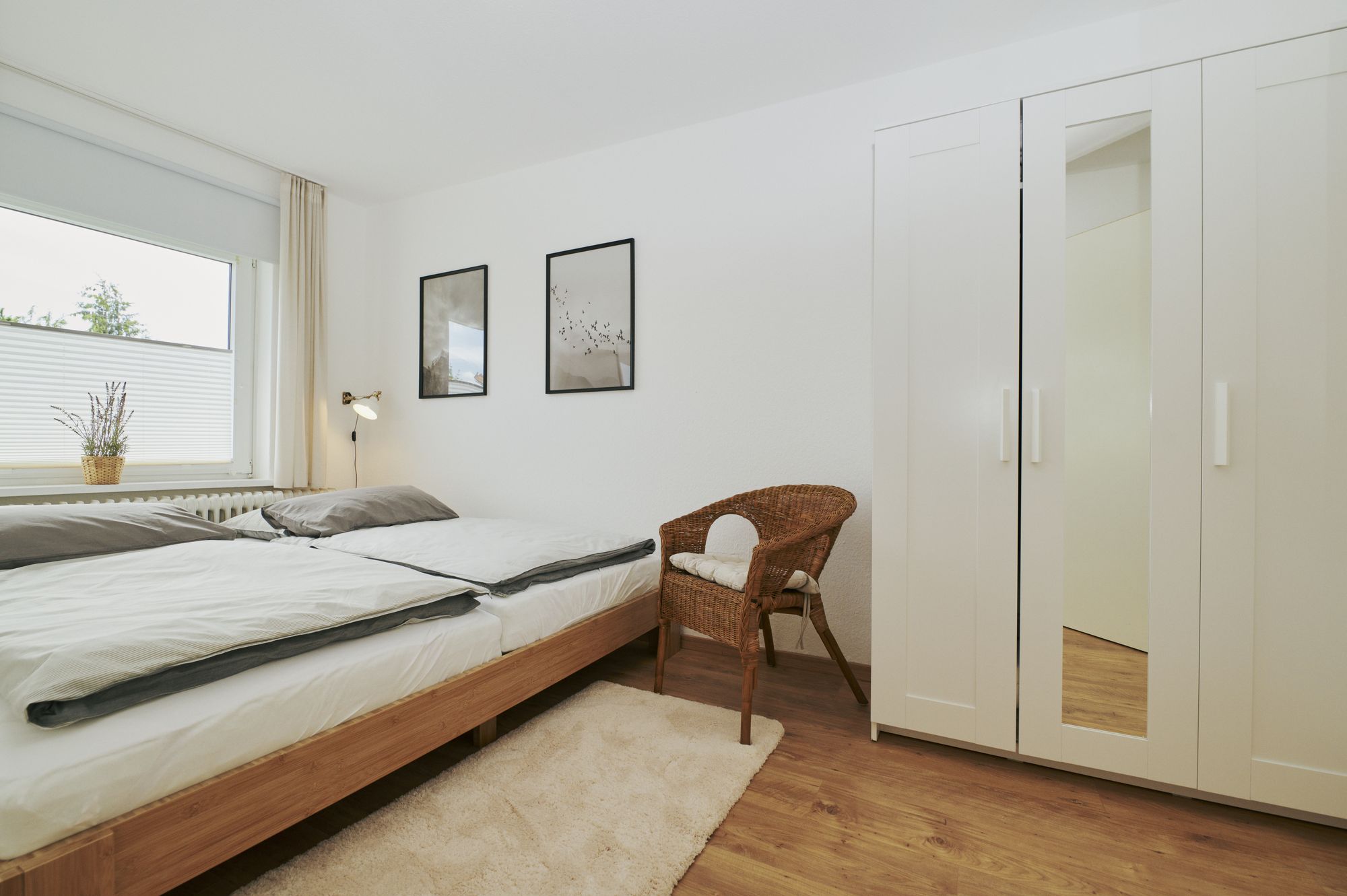 Schlafzimmer mit Doppelbett (1,80m x 2,00m), großem Kleiderschrank, Ganzkörperspiegel und Korbsessel