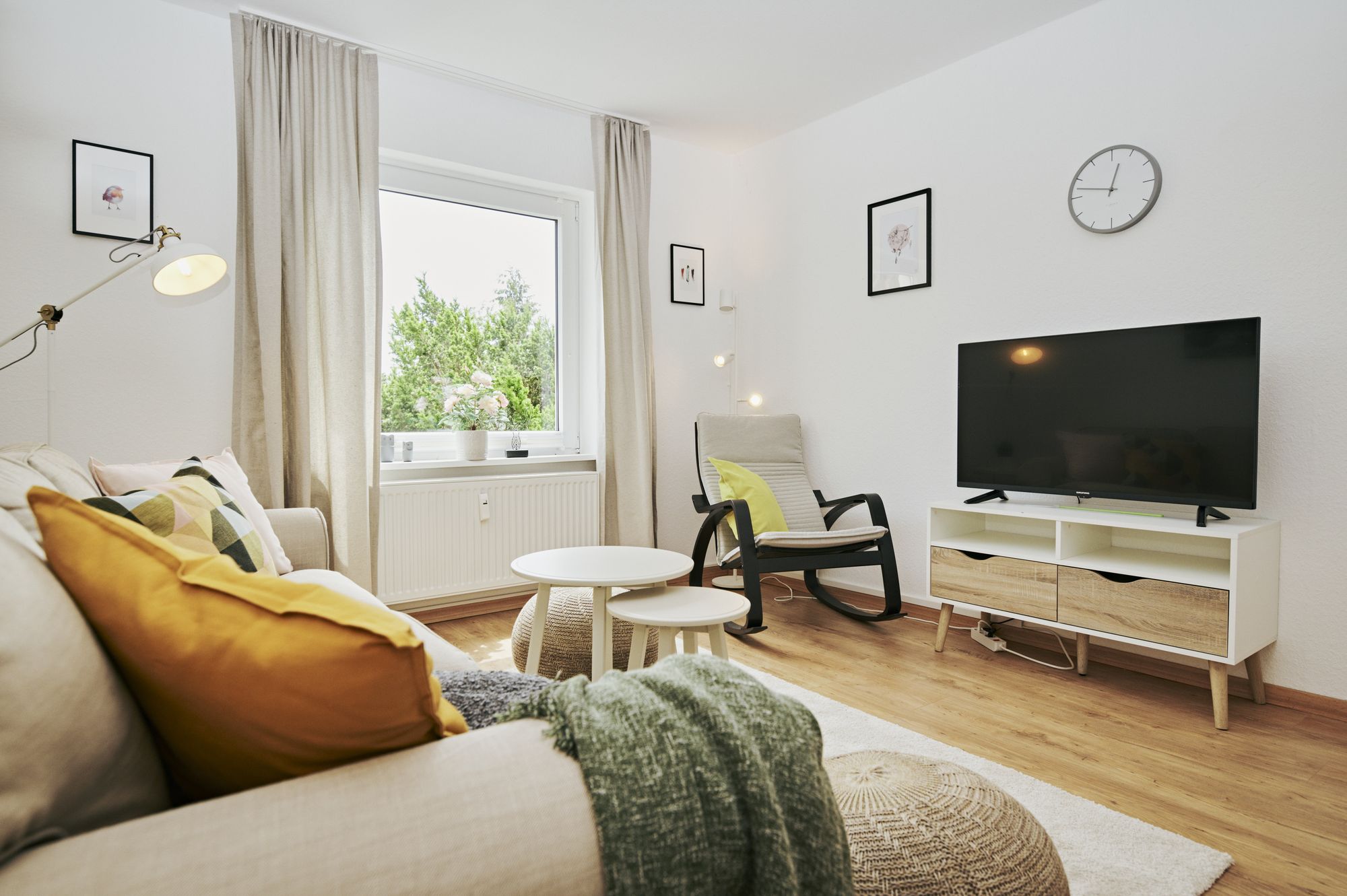 Wohnzimmer mit gemütlichem Sofa (3-Sitzer) und Schaukelstuhl, Flachbildschirm mit 43 Zoll (Smart-TV), DVD/Blue-Ray Player