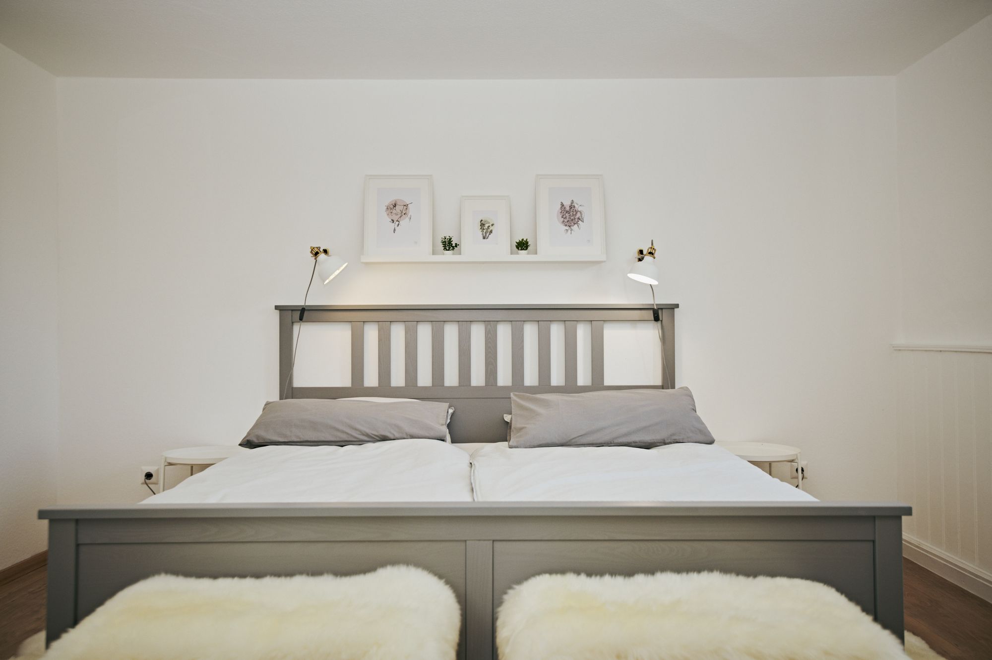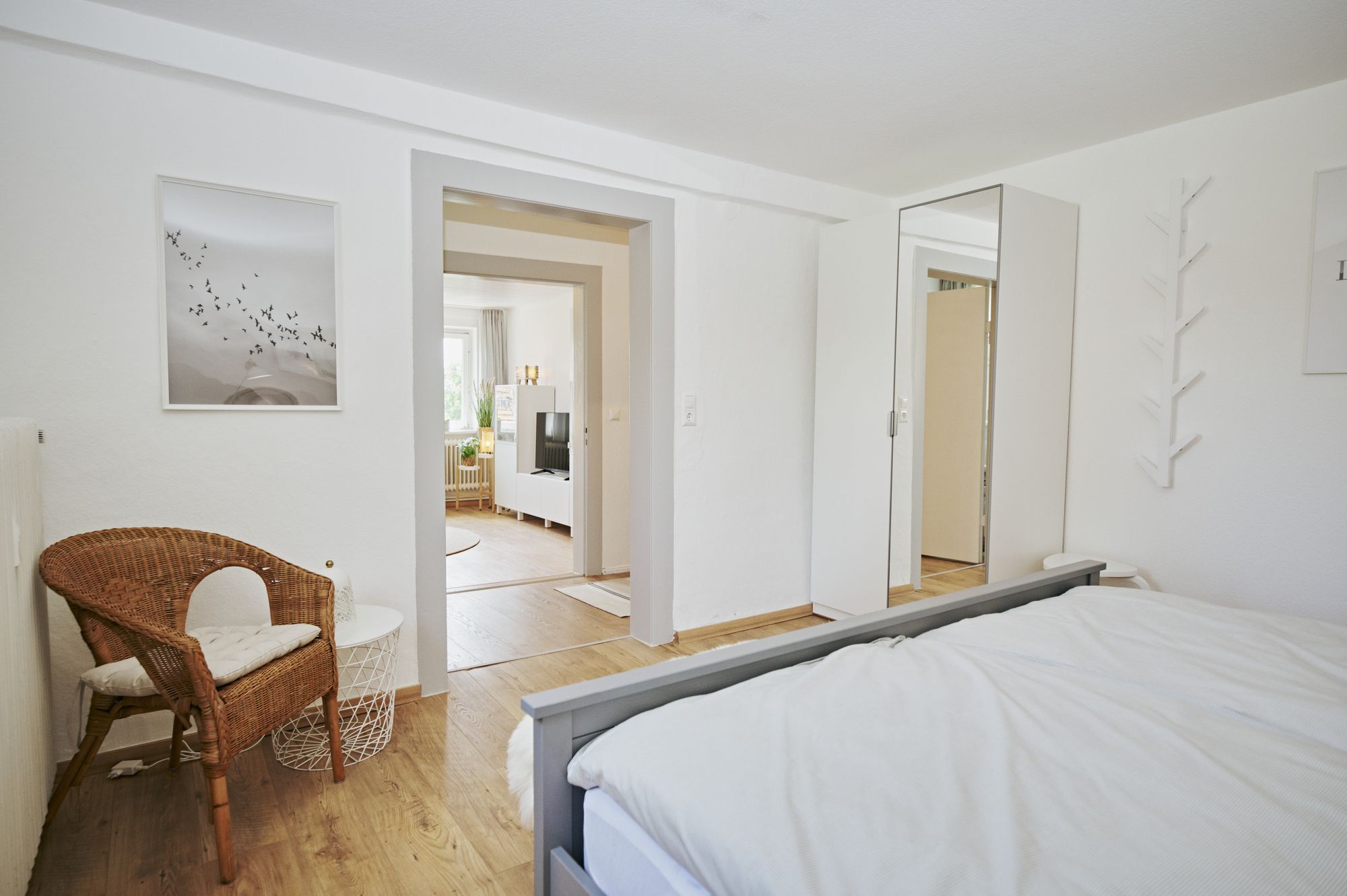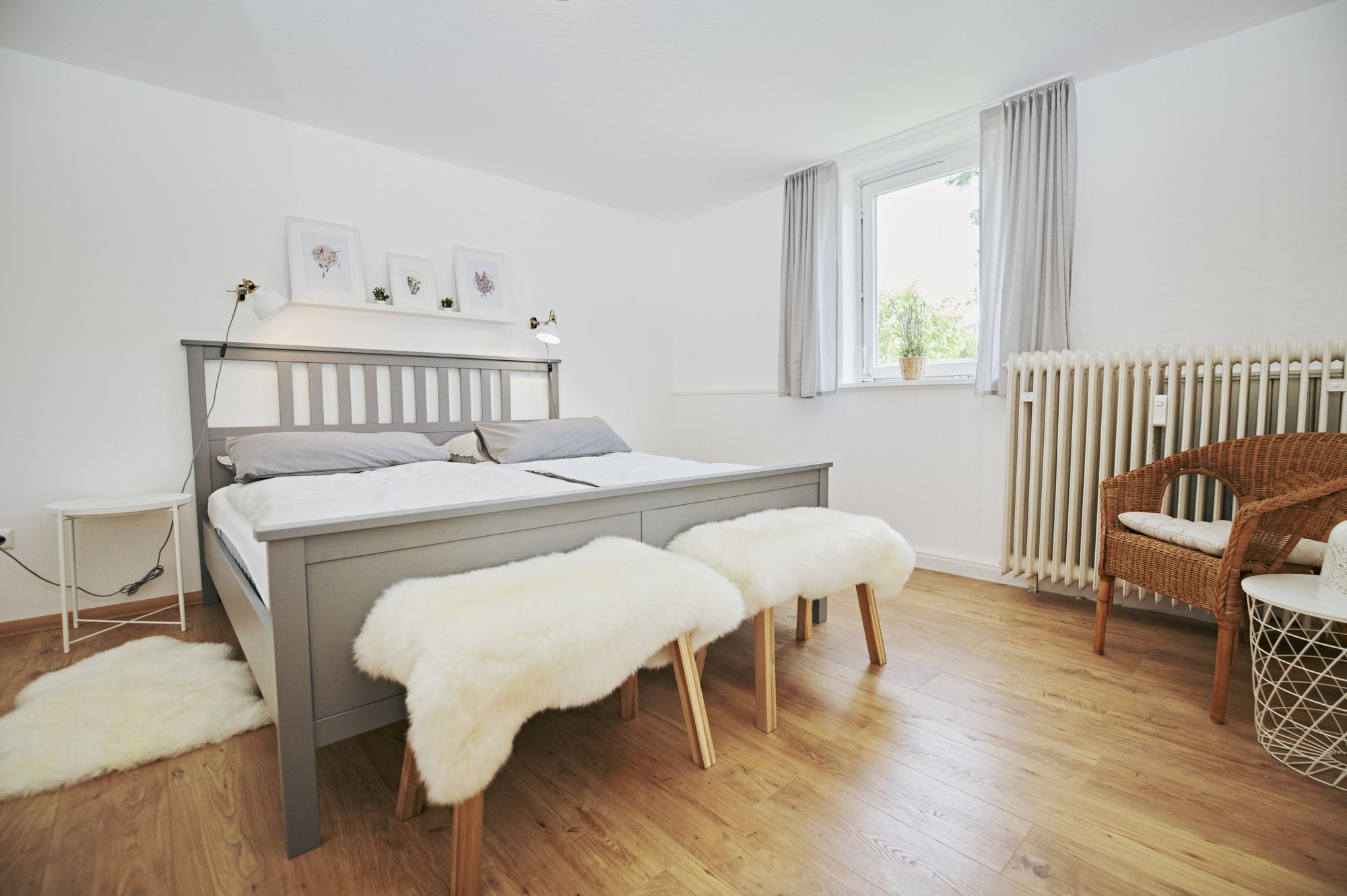 Schlafzimmer mit Doppelbett (1,80m x 2,00m), Kleiderschrank mit Ganzkörperspiegel und Korbsessel