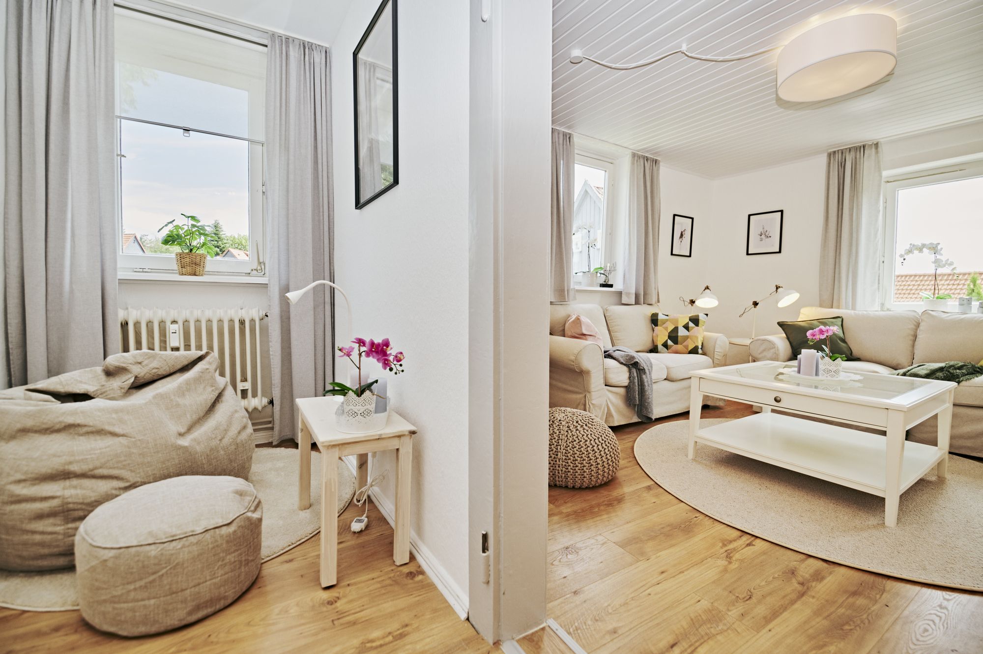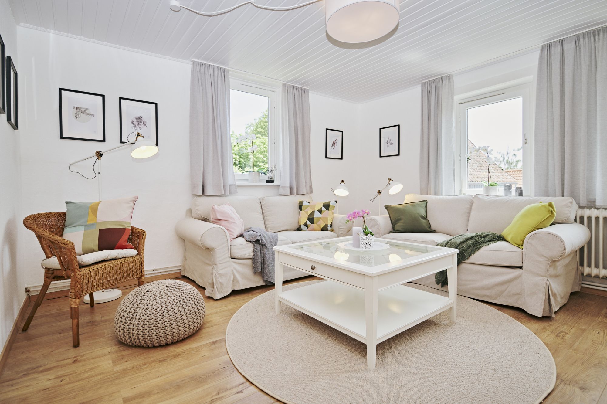 Wohnzimmer mit zwei gemütlichen 2-Sitzern), Korbstuhl, Flachbildschirm mit 43 Zoll (Smart-TV), DVD/Blue-Ray Player