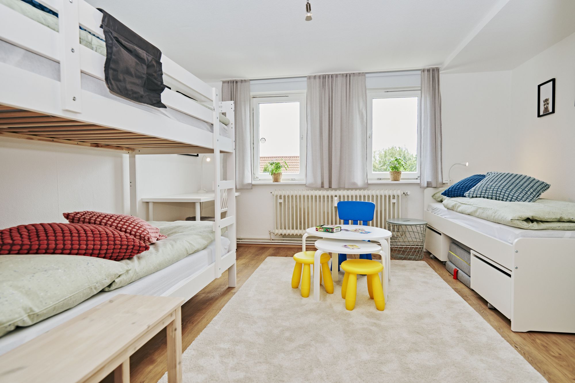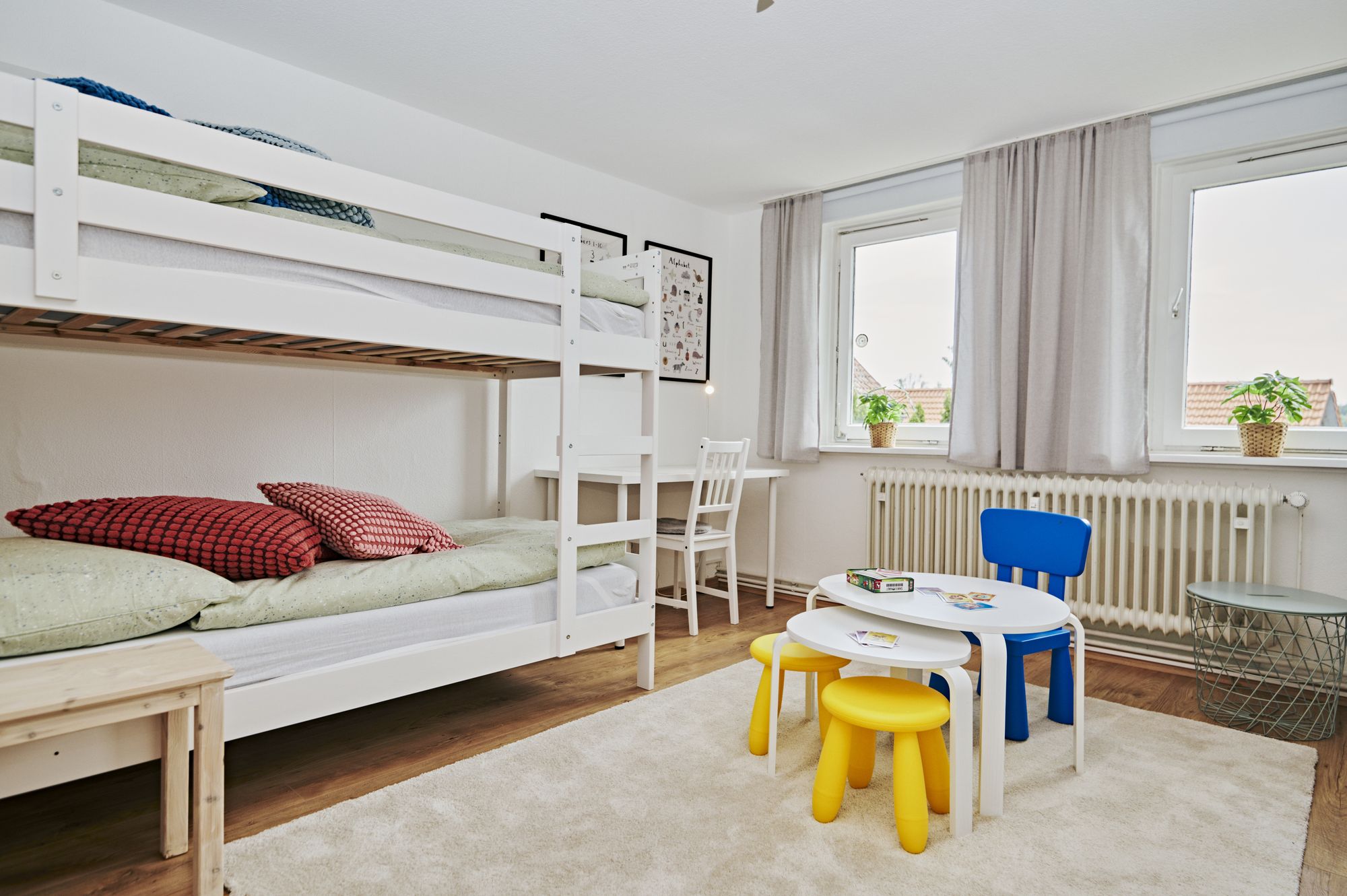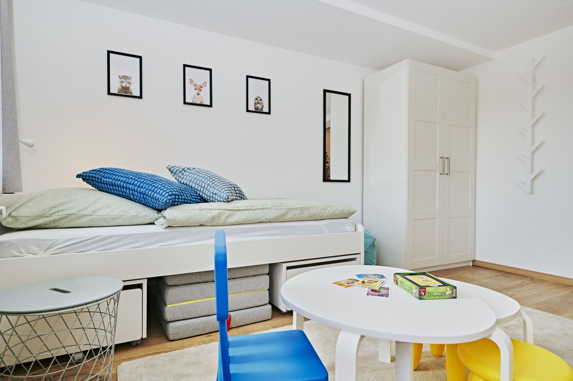 Kinder-/Schlafzimmer mit Doppelstockbett und separatem Einzelbett, Kleiderschrank, Schreib- und Basteltisch, Kinder-Sitzgruppe