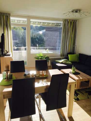 In einer kleinen Appartementanlage befinden sich unsere drei Ferienwohnungen - eine davon ist die moderne Ferienwohnung Fuchsbau im 1. Obergeschoss für 4 Personen. Hell-Dunkel-Kontraste durchziehen die Ferienwohnung, aufgefrischt durch lindgrüne Akzente. Auf den gehobenen Komfort wurde in allen Räumen geachtet - in der voll ausgestatteten Küche, dem lichtdurchfluteten Sitz- und Essbereich im Wohnzimmer oder dem gemütlichen `Traumraum` (Schlafzimmer).