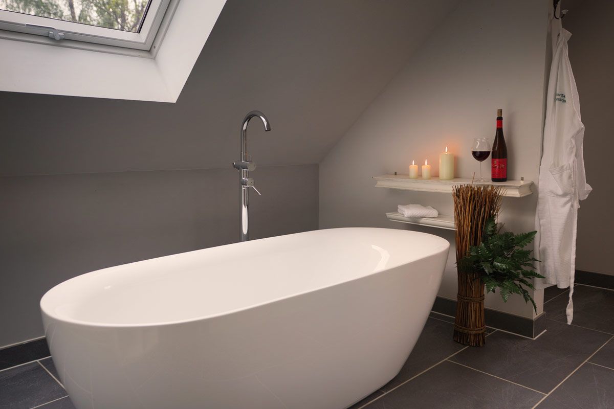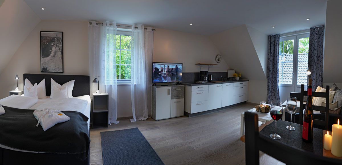 Genießen Sie den Aufenthalt in einem modernen Wohlfühl-Ambiente der besonderen Art. Das Familien-Appartement im 1. Obergeschoss des Waldhauses Mandelholz ist ausgestattet mit hochwertigen Möbeln und Accessoires. Wohn- und Schlafbereich befinden sich in einem Raum, der durch viel natürlichen Lichteinfall hell und freundlich wirkt. Ein ganz besonderes Highlight ist das großräumige Bad mit einer imposanten Walk-In-Dusche und einer ovalen, frei stehenden Badewanne - direkt unter dem Dachfenster mit Blick in den (Sternen-) Himmel.
