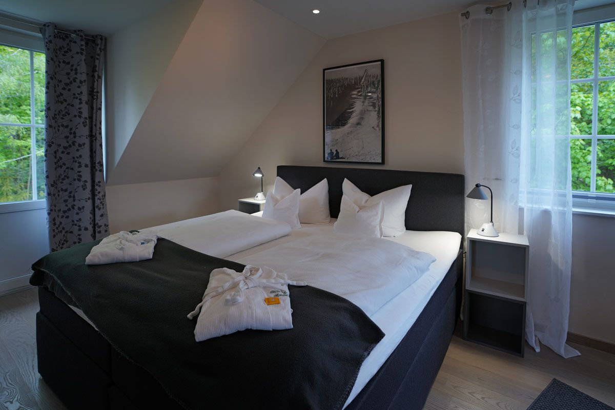 Sofern Sie zu viert anreisen oder eine Schlafmöglichkeit nicht ausreicht, können Sie im Obergeschoss gern ein separates Schlafzimmer mit Doppelbett und Fernseher hinzubuchen.