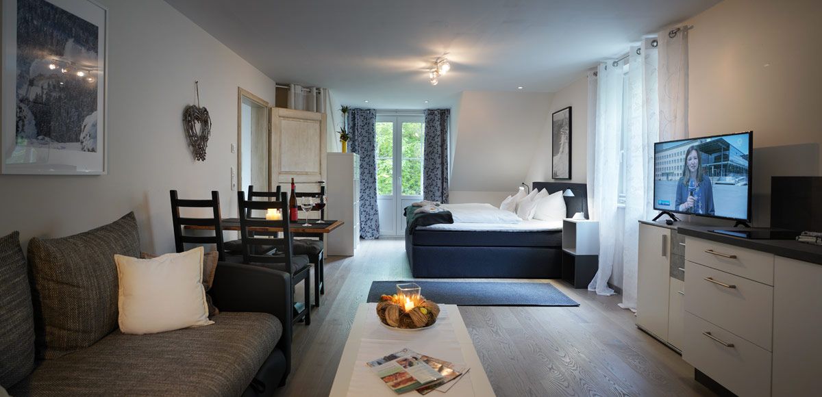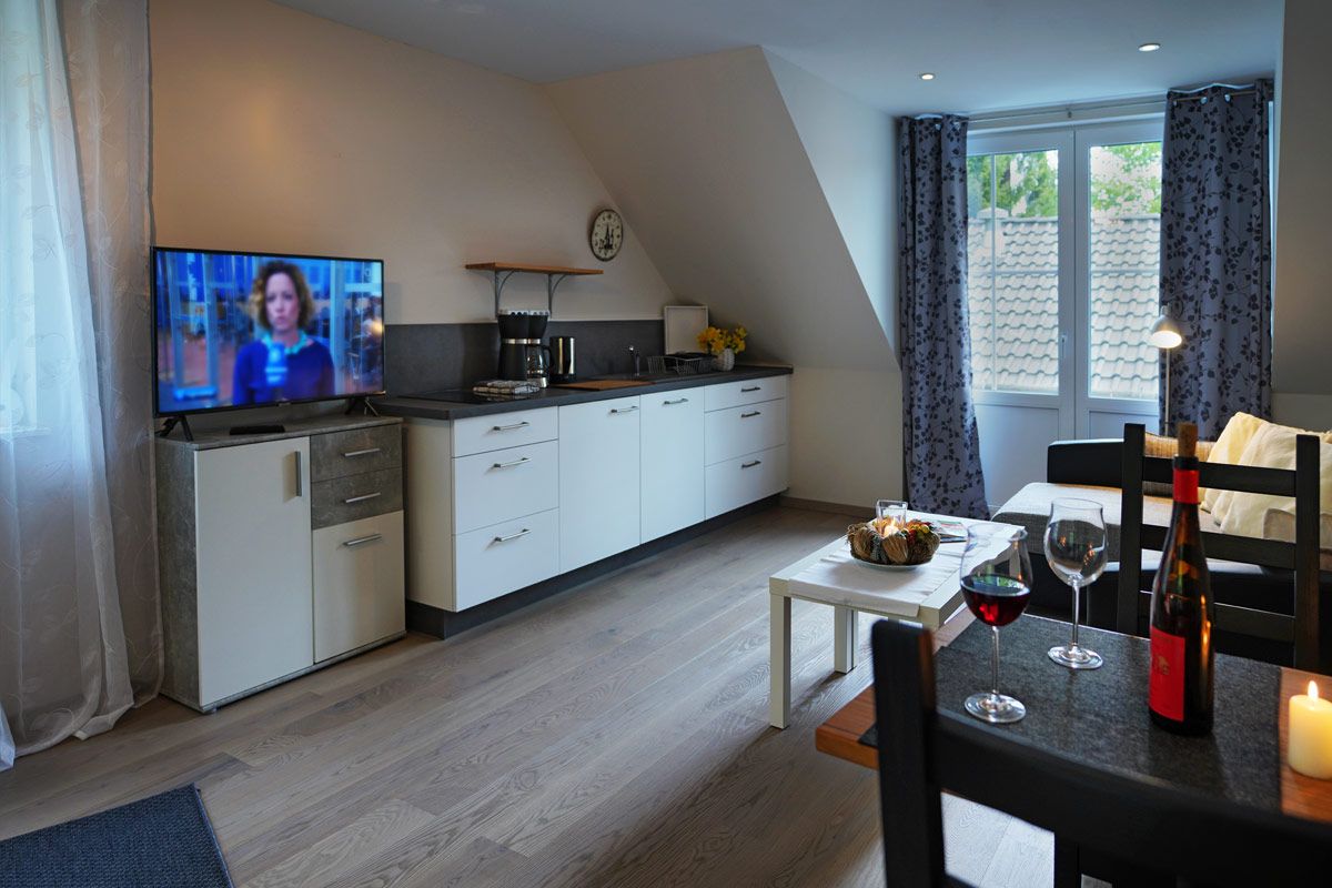 Großer Wohnbereich mit bequemer Sitzecke und Fernseher, Doppelbett, kleine Küchenzeile (2-Platten-Ceranfeld, Kühlschrank, Kaffeemaschine, Wasserkocher) sowie einem Esstisch mit 4 Stühlen.
