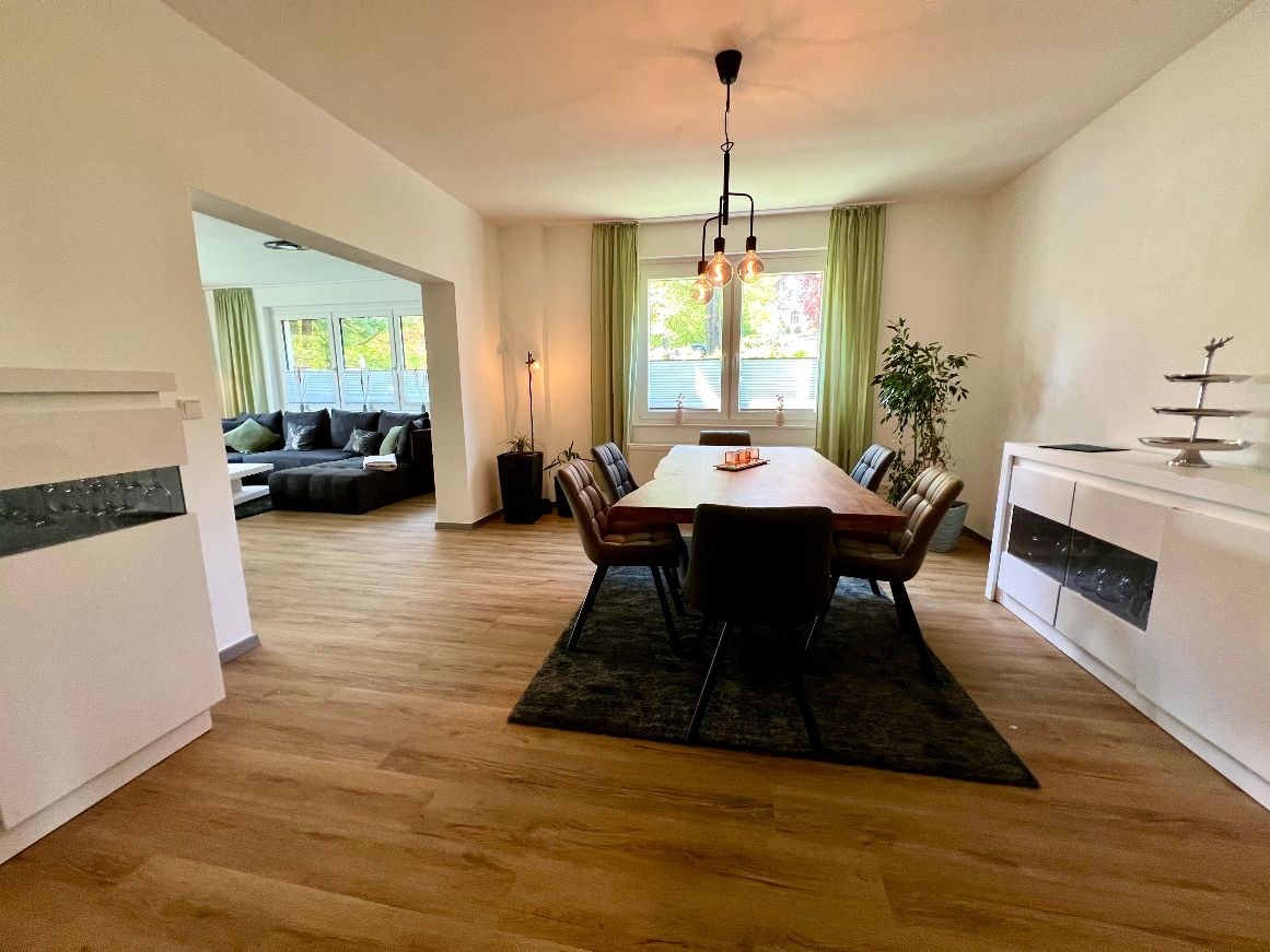 Wohnzimmer mit großer Couch (mit Schlaffunktion - Aufbettung), Fernseher, Esszimmer mit grroßem Holz-Esstisch für max. 8 Personen