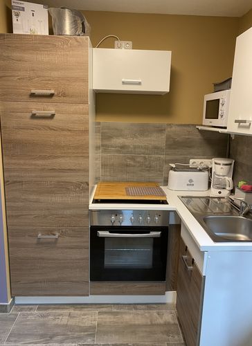 Kleiner Küchenbereich mit 4-Felder-Cerankochfeld, Backofen, Kühlschrank mit Tiefkühlfach, Kaffeemaschine, Wasserkocher, Abwasch-Spüle (kein Geschirrspüler!)