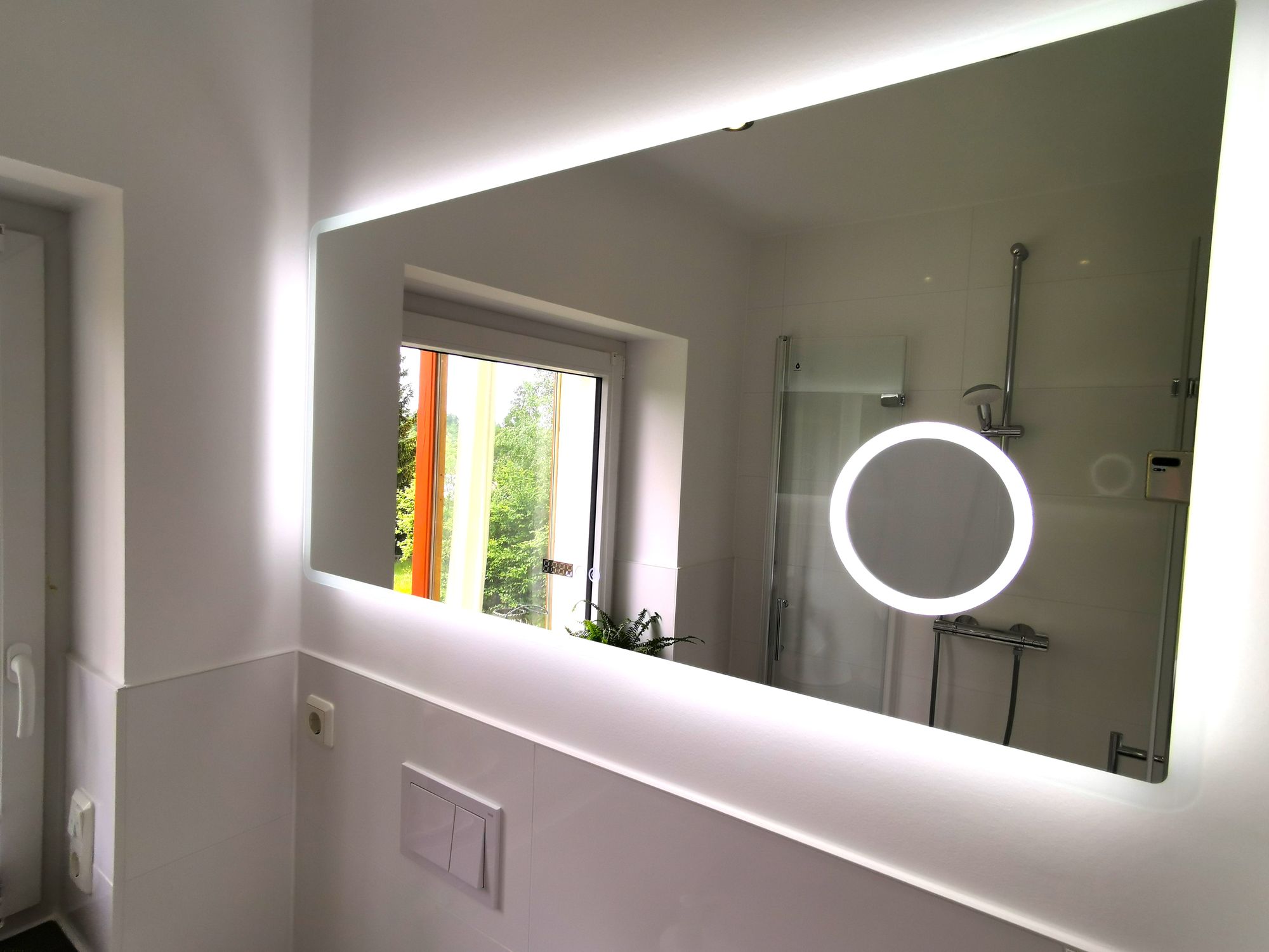Zwei Bäder - jeweils mit ebenerdiger 120x120 Meter Dusche mit Glasschwingtüren, WC, Waschtisch, XXL-Wandspiegel mit integriertem Vergrößerungsspiegel und Spiegelheizung (Anti-Beschlag-Funktion)