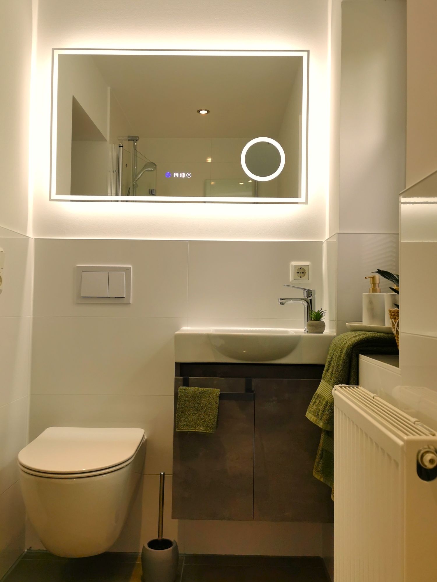 Jedes der zwei Badezimmer ist mit Waschtisch und Push-Open-Ablaufventil, XXL-Wandspiegel mit integriertem Vergrößerungsspiegel mit Spiegelheizung Anti-Beschlag-Funktion und ebenerdigen 1,2-Meter-Duschen mit Glasschwingtüren konzipiert.