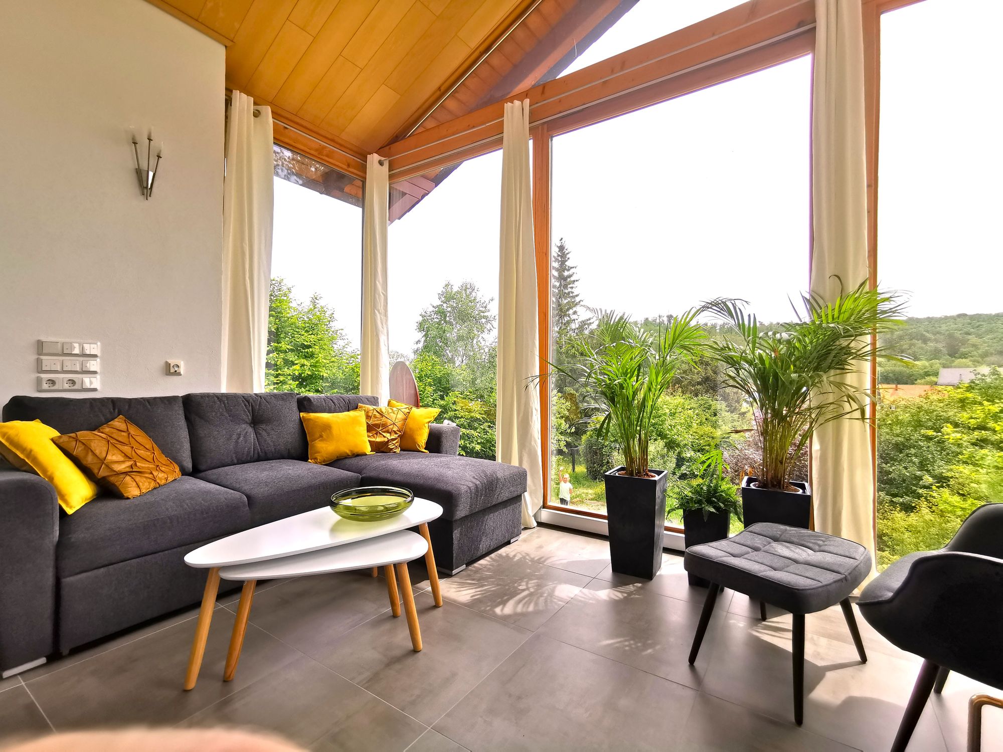 Einzigartig sind der über 4 Meter hohe und drei Seiten umfassende Wintergarten mit Kamin und die traumhafte Waldblick-Aussicht. Die satinierten Glasschiebetüren im gesamten Ferienhaus sorgen für viel Licht und Wohlfühlatmosphäre.