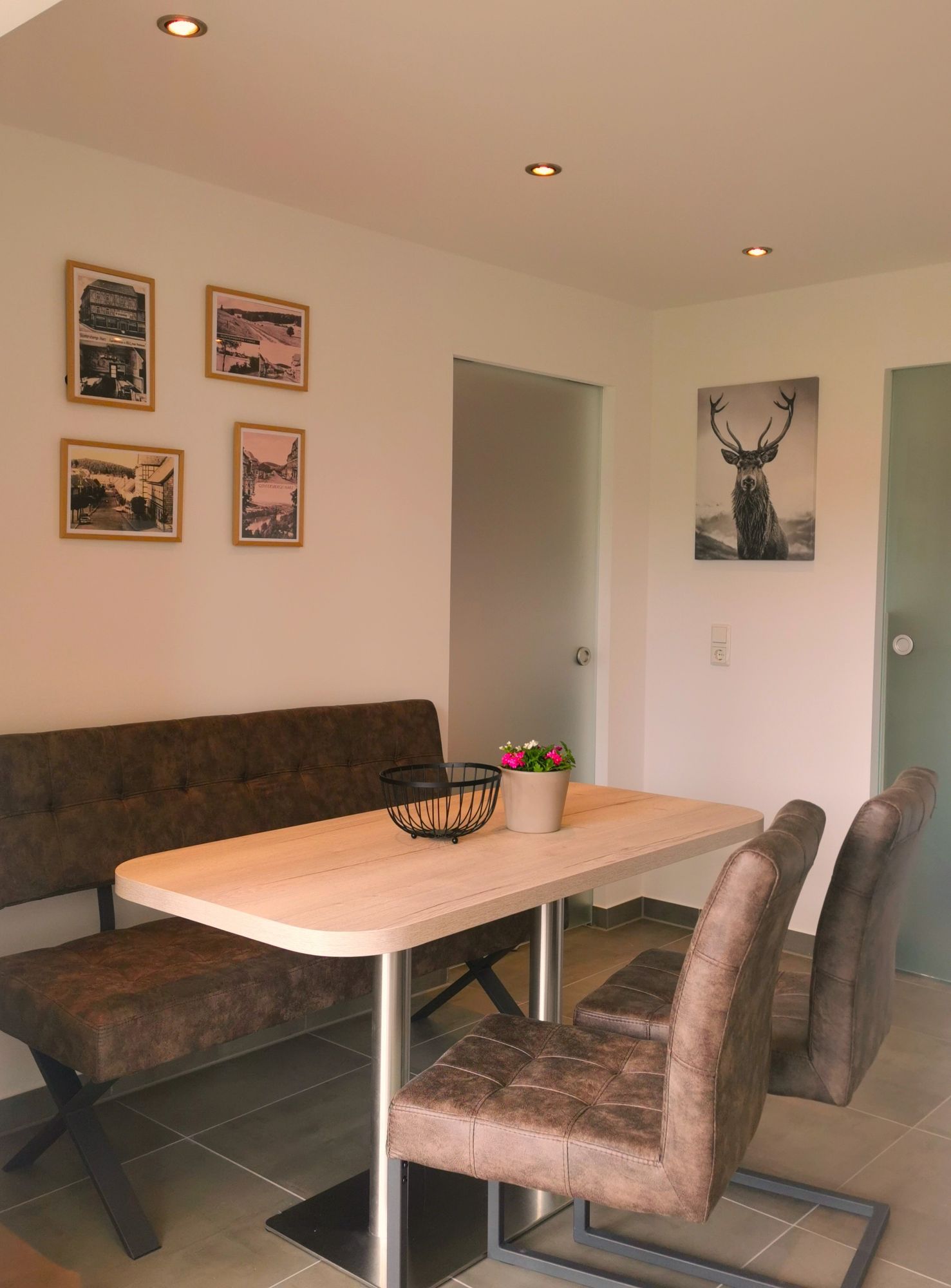 Essbereich mit Tisch, Sitzbank und zwei Stühlen