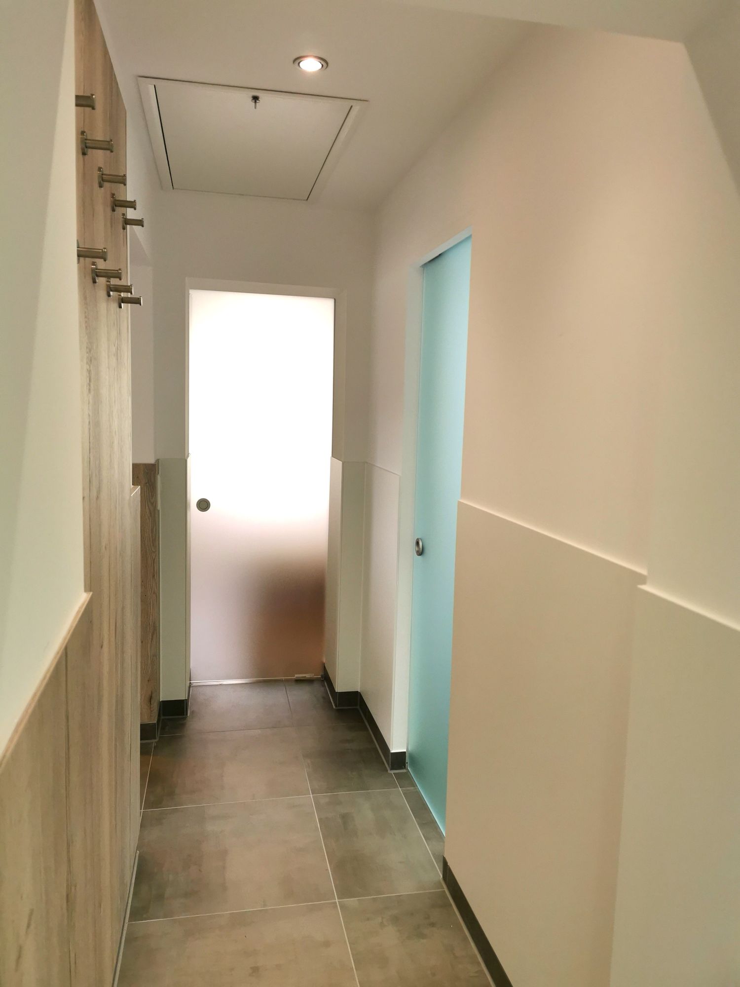 Satinierte Schiebetüren sparen Platz im gesamten Ferienhaus.